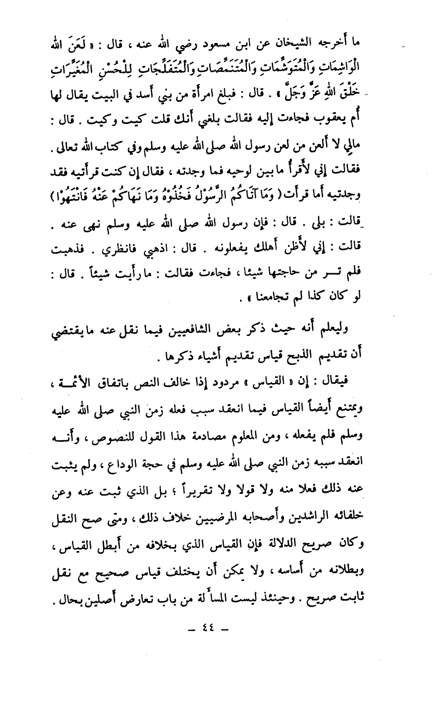 فيقال: إن " القياس" مردود إذا خالف النص باتفاق الأئمة، ويمتنع أيضاً القيام فيما انعقد سبب فعله زمن النبي صلى الله عليه وسلم فلم يفعله، ومن المعلوم مصادمة هذا القول للنصوص، وأنه انعقد سببه زمن النبي صلى الله عليه وسلم في حجة الوداع، ولم يثبت عنه ذلك فعلاً منه ولا قولاً ولا تقريراً، بل الذي ثبت عنه وعن خلفائه الراشدين وأصحابه المرضيين خلاف ذلك، ومتى صح النقل وكان صريح الدلالة فإن القياس الذي بخلافه من أبطل القياس، وبطلانه من أساسه، ولا يمكن أن يختلف قياس صحيح مع نقل ثابت صريح، وحينئذ ليست المسألة من باب تعارض أصلين بحال،