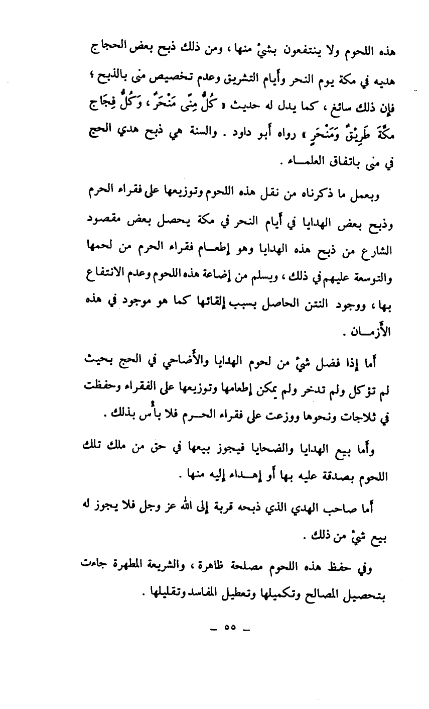 هذه اللحوم ولا ينتفعون بشيء منها، ومن ذلك ذبح بعض الحجاج هديه في مكة يوم النحر وأيام التشريق وعدم تخصيص منى بالذبح، فإن ذلك سائغ، كما يدل له حديث " كل منى منحر، وكل فجاج مكة طريق ومنحر" رواه أبو داود. والسنة هي ذبح هدي الحج في منى باتفاق العلماء.