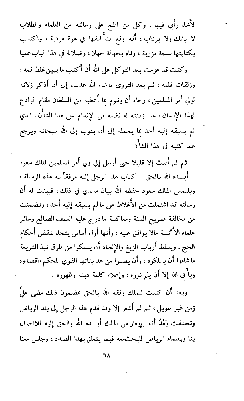 ثم لم ألبث إلا قليلاً حتى أرسل إلي ولي أمر المسلمين الملك سعود ـ أيده الله بالحق ـ كتاب هذا الرجل إليه مرفقاً به هذه الرسالة، ويلتمس الملك سعود حفظه الله بيان ما لدي في ذلك، فبينت له أن رسالته قد اشتملت من الأغلاط على ما لم يسبقه إليه أحد، وتضمنت من مخالفة صريح السنة ومعاكسة ما درج عليه السلف الصالح وسائر علماء الأئمة مالا يوافق عليه، وأنها أول أساس يتخذ لنقض أحكام الحج، ويسلط أرباب الزيغ والإلحاد أن يسلكوا من طرق نبذ الشريعة ما شاءوا أن يسلكوه، وأن يصلوا من هد بنائها القوي المحكم ما قصدوه ويأبى الله إلا أن يتم نوره، وإعلاء كلمة دينه وظهوره.