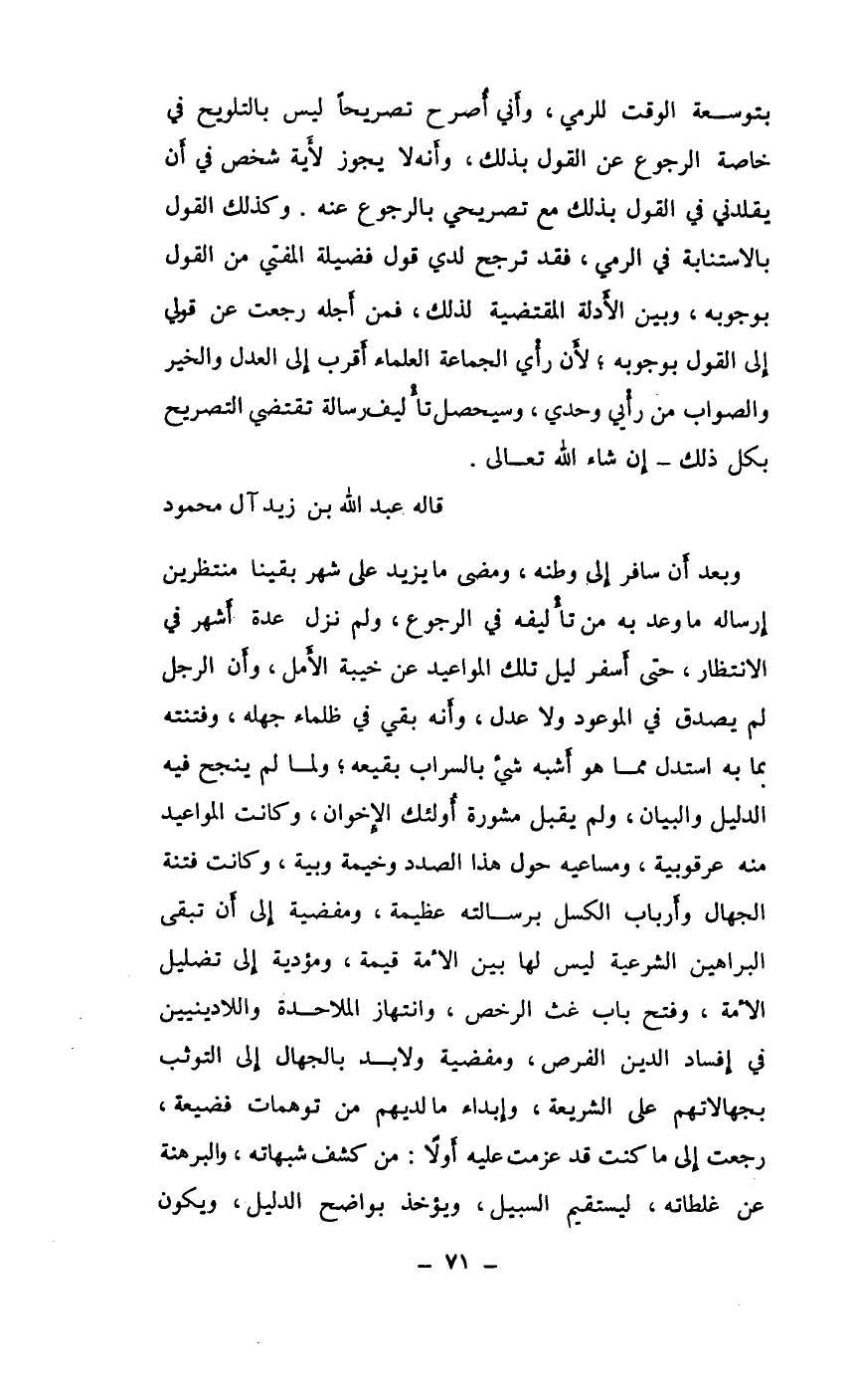 بتوسعة الوقت للرمي، وأني أُصرح تصريحاً ليس بالتلويح في خاصة الرجوع عن القول بذلك، وأنه لا يجوز لأية شخص في أن يقلدني في القول بذلك مع تصريحي بالرجوع عنه. وكذلك القول الاستنابة في الرمي، فقد ترجح لدي قول فضيلة المفتي من القول بوجوبه، وبين الأدلة المقتضية لذلك، فمن أجله رجعت عن قولي إلى القول بوجوبه، لأن رأي الجماعة العلماء أقرب إلى العدل والخير والصواب من رأي وحدي، وسيحصل تأليف رسالة تقتضي التصريح بكل ذلك ـ إن شاء الله تعالى.