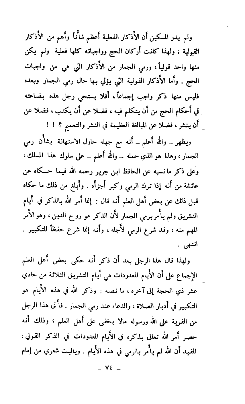 ولم يدر المسكين أن الاذكار الفعلية أعظم شأناً وأهم من الأذكار القولية، ولهذا كانت أركان الحج وواجباته كلها فعلية ولم يكن منها واحد قولياً، ورمي الجمار من الأذكار التي هي من واجبات الحج. وأما الأذكار القولية التي يؤتي بها حال رمي الجمار وبعده فليس منها ذكر واجب إجماعاً، أفلا يستحي رجل هذه بضاعته في أحكام الحج من أن يتكلم فيه، فضلاً عن أن يكتب، فضلاً عن أن ينشر، فضلاً عن المبالغة العظيمة في النشر والتعميم؟ !!
