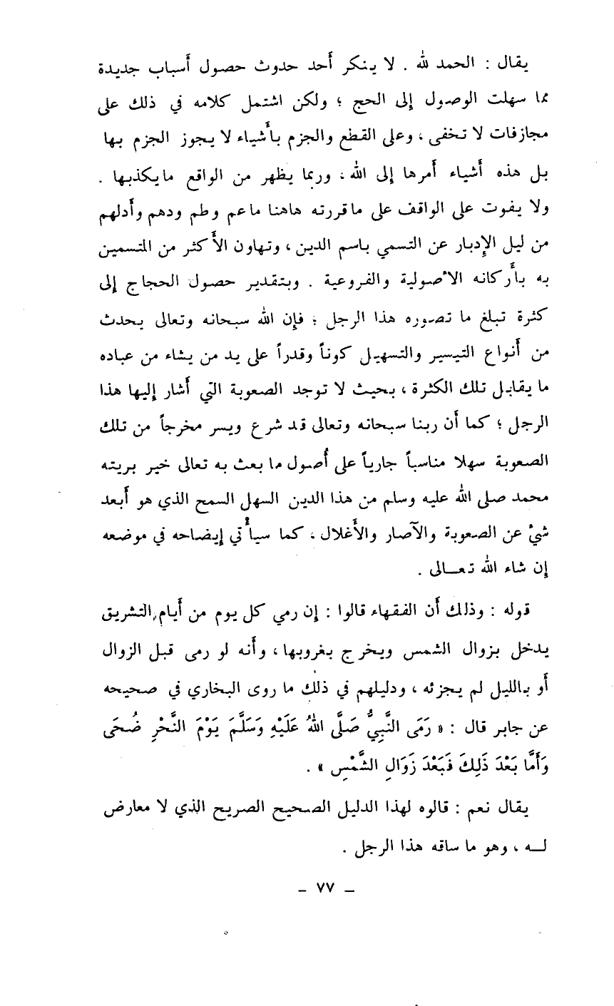 ولا يفوت على الواقف على ما قررته هاهنا ماعم وطم ودهم وأدلهم من ليل الإدبار عن التسمي باسم الدين، وتهاون الأكثر من المتسمين به بأركانه الأصولية والفروعية. وبتقدير حصول الحجاج إلى كثرة تبلغ ما تصوره هذا الرجل، فإن الله سبحانه وتعالى يحدث من أنواع التيسير والتسهيل كوناً وقدراً على يد من يشار من عباده ما يقابل تلك الكثرة، بحيث لا توجد الصعوبة التي أشار إليها هذا الرجل، كما أن ربنا سبحانه وتعالى قد شرع ويسر مخرجاً من تلك الصعوبة سهلاً مناسباً جارياً على أصول ما بعث به تعالى خير بريته محمد صلى الله عليه وسلم من هذا الدين السهل السمح الذي هو أبعد شيء عن الصعوبة والآصار والأغلال، كما سيأتي إيضاحه في موضعه إن شاء الله تعالى.