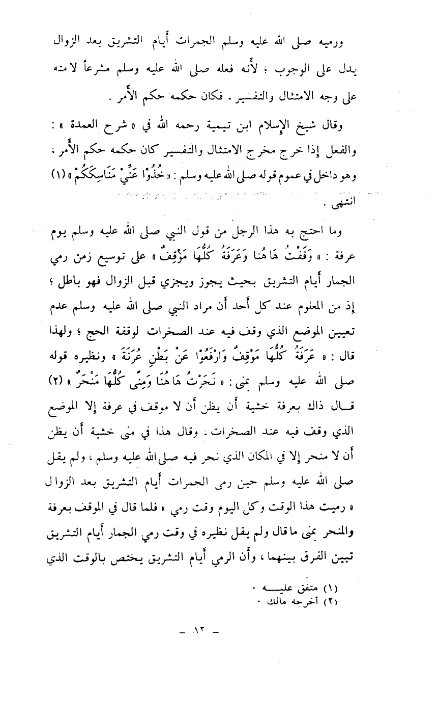 وما احتج به هذا الرجل من قول النبي صلى الله عليه وسلم يوم عرفة: " وقفت هاهنا وعرفة كلها موقف" على توسيع زمن رمي الجمار أيام التشريق بحيث يجوز ويجزي قبل الزوال فهو باطل، إذ من المعلوم عند كل أ؛ د أن مراد النبي صلى الله عليه وسلم عدم تعيين الموضع الذي وقف فيه عند الصخرات لوقفة الحج، ولهذا قال: " عرفة كلها موقف وارفعوا عن بطن عرنة" ونظيره قوله صلى الله عليه وسلم بمنى: " نحرت هاهنا ومنى كلها منحر" (¬2) قال ذاك بعرفة خشية أن يظن أن لا موقف في عرفة إلا الموضع الذي وقف فيه عند الصخرات، وقال هذا في منى خشية أن يظن أن لا منحر إلا في المكان الذي نحر فيه صلى الله عليه وسلم، ولم يقل صلى الله عليه وسلم حين رمى الجمرات أيام التشريق بعد الزوال " رميت هذا الوقت وكل اليوم وقت رمي" فلما قال في الموقف بعرفة والمنحر بمنى ما قال ولم يقل نظيره في وقت رمي الجمار أيام التشريق تبين الفرق بينهما، وأن الرمي أيام التشريق يختص بالوقت الذي