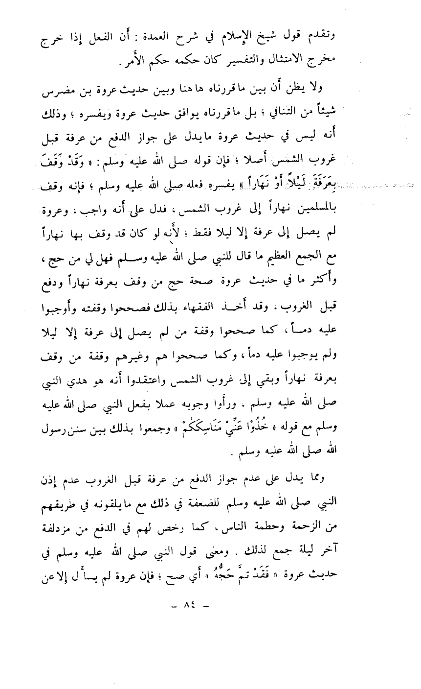 ولا يظن أن بين ما قررناه ها هنا وبين حديث عروة بن مضرس شيئاً من التنافي، بل ما قررناه يوافق حديث عروة ويفسره؛ وذلك أنه ليس في حديث عروة ما يدل على جوز الدفع من عرفة قبل غروب الشمس أصلاً؛ فإن قوله صلى الله عليه وسلم: " وقد وقف بعرفة ليلاً أو نهاراً " يفسره فعله صلى الله عليه وسلم؛ إنه وقف المسلمين نهاراً إلى غروب الشمس؛ فدل على أنه واجب، وعروة لم يصل إلى عرفة إلا ليلاً فقط؛ لأنه لو كان قد وقف بها نهاراً مع الجمع العظيم ما قال للنبي صلى الله عليه وسلم فهل لي من حج، وأكثر ما في حديث عروة صحه حج من وقف بعرفة نهاراً ودفع قبل الغروب، وقد أخذ الفقهاء بذلك فصححوا وقفته وأوجبوا عليه دماً ظ، كما صححوا وقفة من لم يصل إلى عرفة إلا ليلاً ولم يوجبوا عليه دماً، وكما صححوا هم وغيرهم وقفة من وقف بعرفة نهاراً وبقي إلى غروب الشمس واعتقدوا أنه هو هدي النبي صلى الله عليه وسلم، ورأو وجوبه عملاً بفعل النبي صلى الله عليه وسلم مع قوله: " خذوا عني مناسككم " وجمعوا بذلك بين سنن رسول الله صلى الله عليه وسلم.