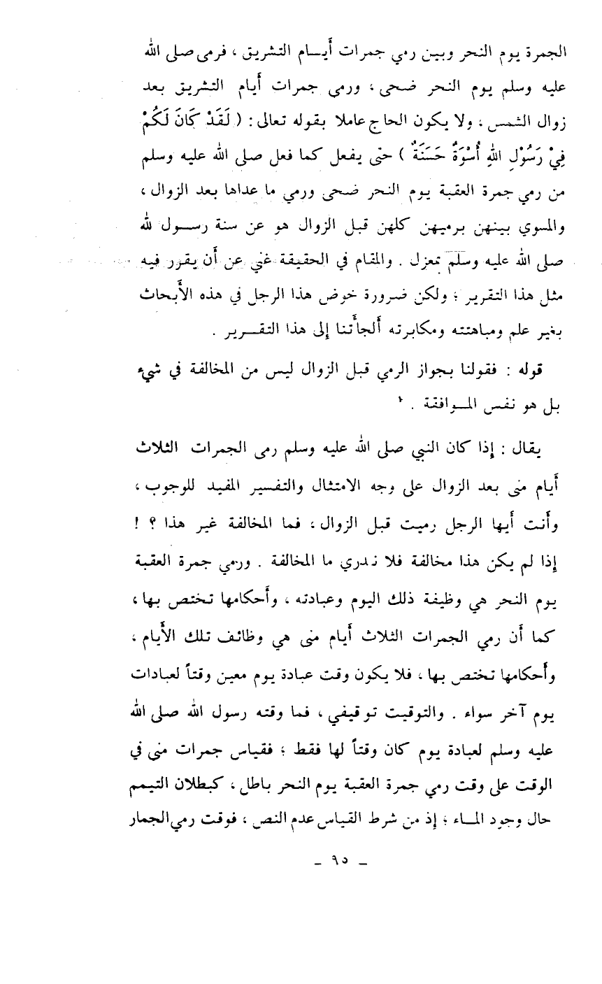 الجمرة يوم النحر وبين رمي جمرات أيام التشريق، فرمى صلى الله عليه وسلم يوم النحر ضحى، ورمى جمرات أيام التشريق بعد زوال الشمس، ولا يكون الحاج عاملاً بقوله تعالى {لقد كان لكم في رسول الله أسوة حسنة} حتى يفعل كما فعل صلى الله عليه وسلم من رمي جمرة العقبة يوم النحر ضحى ورمي ما عداها بعد الزوال، والمسوي بينهن برميهن كلهن قبل الزوال هو عن سنة رسول الله صلى الله عليه وسلم بمعزل. والمقام في الحقيقة غني عن أن يقرر فيه مثل هذا التقرير، ولكن ضرورة خوض هذا الرجل في هذه الأبحاث بغير علم ومباهتته ومكابرته ألجأتنا إلى هذا التقرير.