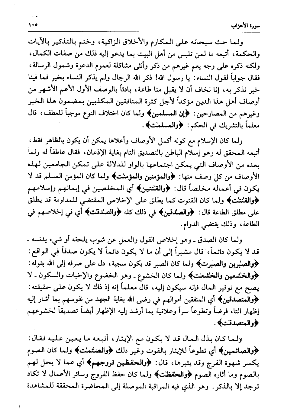ولما حث سبحانه على المكارم والأخلاق الزاكية ، وختم بالتذكير بالآيات والحكمة ، أتبعه لمن تلبس من أهل البيت بما يدعو إليه ذلك من صفات الكمال ، وبكنه ذكره على وجه يعم غيرهم من ذكر وأنثى مشاكلة لعموم الدعوة وشمول الرسالة ، فقال جواباً لقول النساء : يا رسول الله ذكر الله الرجال ولم يذكر النساء بخير فما فينا خير نذكر به ، إنا نخاف أن لا يقبل منا طاعة ، بادئاً الوصف الأول الأعم الأشهر من أوصاف أهل هذا الدين مؤكداً لأجل كثرة المنافقين المكذبين بمضمون هذا الخبر وغيرهم من المصارحين : ( إن المسلمين ( ولما كان اختلاف النوع موجباً للعطف ، قال معلماً بالتشريك في الحكم : ( والمسلمات ( .