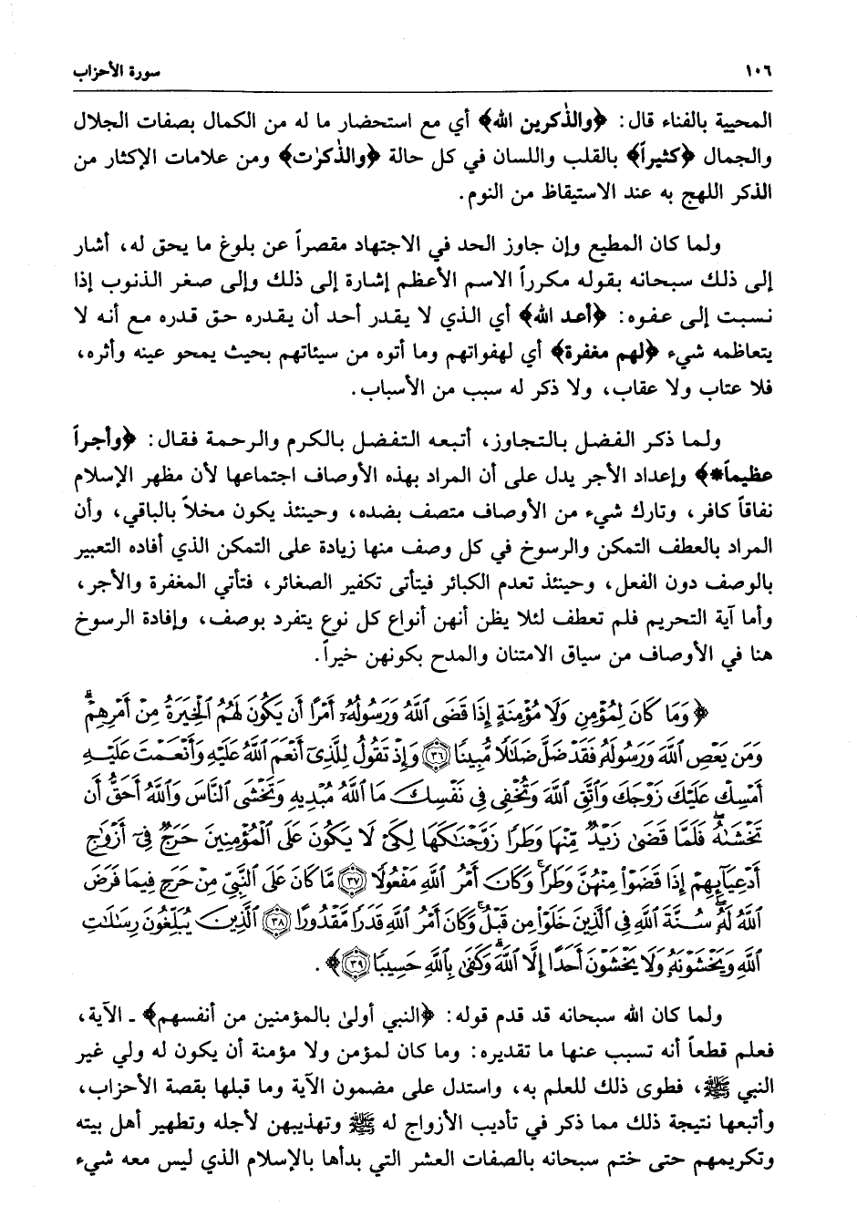 ) وَمَا كَانَ لِمُؤْمِنٍ وَلاَ مُؤْمِنَةٍ إِذَا قَضَى اللَّهُ وَرَسُولُهُ أَمْراً أَن يَكُونَ لَهُمُ الْخِيَرَةُ مِنْ أَمْرِهِمْ وَمَن يَعْصِ اللَّهَ وَرَسُولَهُ فَقَدْ ضَلَّ ضَلاَلاً مُّبِيناً وَإِذْ تَقُولُ لِلَّذِي أَنعَمَ اللَّهُ عَلَيْهِ وَأَنْعَمْتَ عَلَيْهِ أَمْسِكْ عَلَيْكَ زَوْجَكَ وَاتَّقِ اللَّهَ وَتُخْفِي فِي نِفْسِكَ مَا اللَّهُ مُبْدِيهِ وَتَخْشَى النَّاسَ وَاللَّهُ أَحَقُّ أَن تَخْشَاهُ فَلَمَّا قَضَى زَيْدٌ مِّنْهَا وَطَراً زَوَّجْنَاكَهَا لِكَيْ لاَ يَكُونَ عَلَى الْمُؤْمِنِينَ حَرَجٌ فِي أَزْوَاجِ أَدْعِيَآئِهِمْ إِذَا قَضَوْاْ مِنْهُنَّ وَطَراً وَكَانَ أَمْرُ اللَّهِ مَفْعُولاً مَّا كَانَ عَلَى النَّبِيِّ مِنْ حَرَجٍ فِيمَا فَرَضَ اللَّهُ لَهُ سُنَّةَ اللَّهِ فِي الَّذِينَ خَلَوْاْ مِن قَبْلُ وَكَانَ أَمْرُ اللَّهِ قَدَراً مَّقْدُوراً الَّذِينَ يُبَلِّغُونَ رِسَالاَتِ اللَّهِ وَيَخْشَوْنَهُ وَلاَ يَخْشَوْنَ أَحَداً إِلاَّ اللَّهَ وَكَفَى بِاللَّهِ حَسِيباً ( ( )