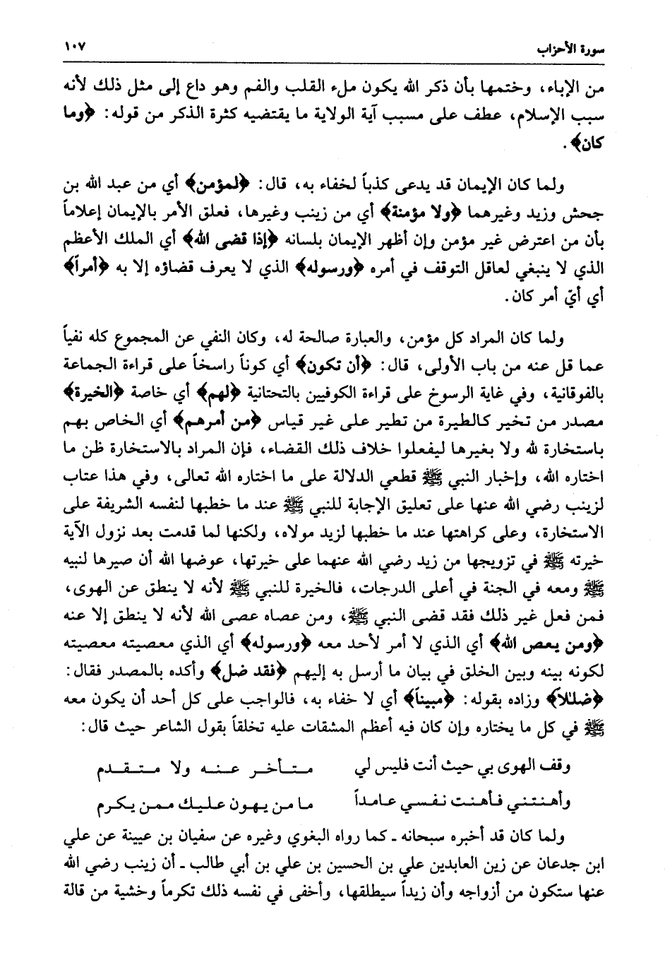 ولما كان المراد كل مؤمن ، والعبارة صالحة له ، وكان النفي عن المجموع كله نفياً عما قل عنه من باب الأولى ، قال : ( أن تكون ) أي كوناً راسخاً على قراءة الجماعة بالفوقانية ، وفي غاية الرسوخ على قراءة الكوفيين بالتحتانية ) لهم ) أي خاصة ) الخيرة ( مصدر من تخير كالطيرة من تطير على غير قياس ) من أمرهم ) أي الخاص بهم باستخارة لله ولا بغيرها ليفعلوا خلاف ذلك القضاء ، فإن المراد بالاستخارة ظن ما اختاره الله ، ولا بغيرها ليفعلوا خلاف ذلك القضاء ، فإن المراد بالاستخارة ظن ما اختاره الله ، وإخبار النبي ( صلى الله عليه وسلم ) قطعي الدلالة على ما اختاره الله تعالى ، وفي هذا عتاب لزينب رضي الله عنها على تعليق الإجابة للنبي ( صلى الله عليه وسلم ) عند ما خطبها لنفسه الشريفة على الاستخارة ، وعلى كراهتها عند ما خطبها لزيد مولاه ، ولكنها لما قدمت بعد نزول الآية خيرته ( صلى الله عليه وسلم ) في تزويجها من زيد رضي الله عنهما على خيرتها ، عوضها الله أن صيرها لنبيه ( صلى الله عليه وسلم ) ومعه في الجنة في أعلى الدرجات ، فالخيرة للنبي ( صلى الله عليه وسلم ) لأنه لا ينطق عن الهوى ، فمن فعل غير ذلك فقد قضى النبي ( صلى الله عليه وسلم ) ، ومن عصاه عصى الله لأنه لا ينطق إلا عنه ) ومن يعص الله ) أي الذي لا أمر لأحد معه ) ورسوله ) أي الذي معصيته معصيته لكونه بينه وبين الخلق في بيان ما أرسل به إليهم ) فقد ضل ( وأكده المصدر فقال : ( ضلالاً ( وزاده بقوله : ( مبيناً ) أي لا خفاء به ، فالواجب على كل أحد أن يكون معه ( صلى الله عليه وسلم ) في كل ما يختاره وإن كان فيه أعظم المشقات عليه تخلفاً بقول الشاعر حيث قال :