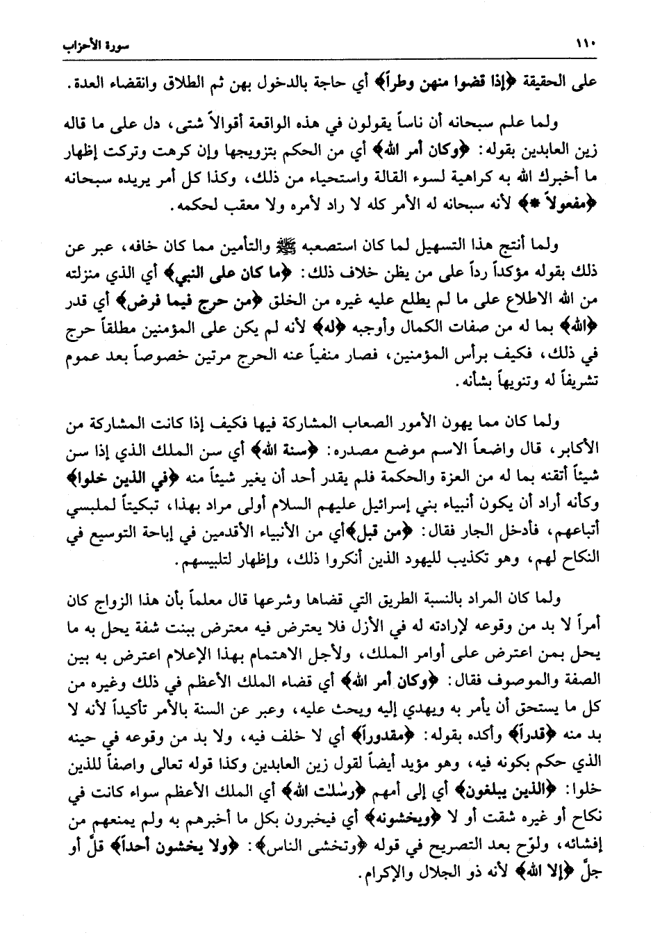 ولما كان المراد بالنسبة الطريق التي قضاها وشرعها قال معلماً بأن هذا الزواج كان أمراً لا بد من وقوعه لإرادته له في الأزل فلا يعترض فيه معترض ببنت شفة يحل به ما يحل بمن اعترض على أوامر الملك ، ولأجل الاهتمام بهذا الإعلام اعترض به بين الصفة الموصوف فقال : ( وكان أمر الله ) أي قضاء الملك الأعظم في ذلك وغيره من كل ما يستحق أن يأمر به ويهدي إليه ويحدث عليه ، وعبر عن السنة بالأمر تأكيداً لانه لا بد منه ) قدراً ( وأكده بقوله : ( مقدوراً ) أي لا خلف فيه ، ولا بد من وقوعه في حينه الذي حكم بكونه فيه ، وهو مؤيد أيضاَ لقول زين العابدين وكذا قوله تعالى واصفاً للذين خلوا : ( الذين يبلغون ) أي إلى أمهم ) رسالات الله ) أي الملك الأعظم سواء كانت في نكاح أو غير شقت أو لا ) ويخشونه ) أي فيخبرون بكل ما أخبرهم به ولم يمنعهم من إفشائه ، ولوّح بعد التصريح في قوله ) وتخشى الناس ( : ( ولا يخشون أحداً ( قلَّ أو جلَّ ) إلا الله ( لأنه ذو الجلال والإكرام .