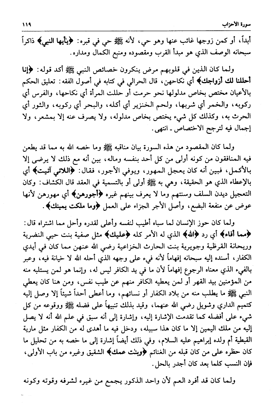 ولما كان المقصود من هذه السورة بيان مناقبه ( صلى الله عليه وسلم ) وما خصه الله به مما قد يطعن فيه المنافقون من كونه أولى من كل أحد بنفسه وماله ، بين أنه مع ذلك لا يرضى إلا بالأكمل ، فبين أنه كان يعجل المهور ، ويوفي الأجور ، فقال : ( اللاتي آتيت ) أي بالإعطاء الذي هو الحقيقة ، وهي به ( صلى الله عليه وسلم ) أولى أو بالتسمية في العقد قال الكشاف : وكان التعجيل ديدن السلف وسنتهم وما لا يعرف بينهم غيره ) أجورهن ) أي مهورهن لأنها عوض عن منفعة البضع ، وأصل الأجر الجزاء على العمل ) وما ملكت يمينك ( ولما كان حوز الإنسان لما سباه أطيب لنفسه وأعلى لقدره وأحل مما اشتراه قال : ( مما أفاء ) أي رد ) الله ( الذي له الأمر كله ) عليك ( مثل صفية بنت حيي النضرية وريحانة القرظية وجويرية بنت الحارث الخزاعية رضي الله عنهن مما كان في أيدي الكفار ، أسنده إليه سبحانه إفهاماً لأن فيء على وجهه الذي أحله الله لا خيانة فيه ، وعبر من المؤمنين بيد القهر أو لمن يعطيه الكافر منهم عن عن طيب نفس ، ومن هنا كان يعطي النبي ( صلى الله عليه وسلم ) ما يطلب منه من بلاد الكفار أو نسائهم ، وما أعطى أحداً شيئاً إلا وصل إليه كتميم الداري وشويل رضي الله عنهما ، وقيد بذلك تنبيهاً على فضله ( صلى الله عليه وسلم ) ووقوعه من كل شيء على أفضله كما تقدمت الإشارة إليه ، وإشارة إلى أنه سبق في في علم الله أنه لا يصل إليه من ملك اليمين إلا ما كان هذا سبيله ، ودخل فيه أهدى له من الكفار مقل ماوية القبطية أم ولده إبراهيم عليه السلام ، وفي ذلك أيضاً إشارة إلى ما خصه به من تحليل ما كان خطره على من كان قبله من الغنائم ) وبنات عمك ( الشقيق وغيره من باب الأولى ، فإن النسب كلما بعد كان أجدر بالحل .