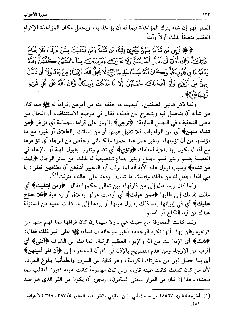 ) تُرْجِي مَن تَشَآءُ مِنْهُنَّ وَتُؤْوِي إِلَيْكَ مَن تَشَآءُ وَمَنِ ابْتَغَيْتَ مِمَّنْ عَزَلْتَ فَلاَ جُنَاحَ عَلَيْكَ ذَلِكَ أَدْنَى أَن تَقَرَّ أَعْيُنُهُنَّ وَلاَ يَحْزَنَّ وَيَرْضَيْنَ بِمَآ آتَيْتَهُنَّ كُلُّهُنَّ وَاللَّهُ يَعْلَمُ مَا فِي قلُوبِكُمْ وَكَانَ اللَّهُ عَلِيماً حَلِيماً لاَّ يَحِلُّ لَكَ النِّسَآءُ مِن بَعْدُ وَلاَ أَن تَبَدَّلَ بِهِنَّ مِنْ أَزْوَاجٍ وَلَوْ أَعْجَبَكَ حُسْنُهُنَّ إِلاَّ مَا مَلَكَتْ يَمِينُكَ وَكَانَ اللَّهُ عَلَى كُلِّ شَيْءٍ رَّقِيباً ( ( )