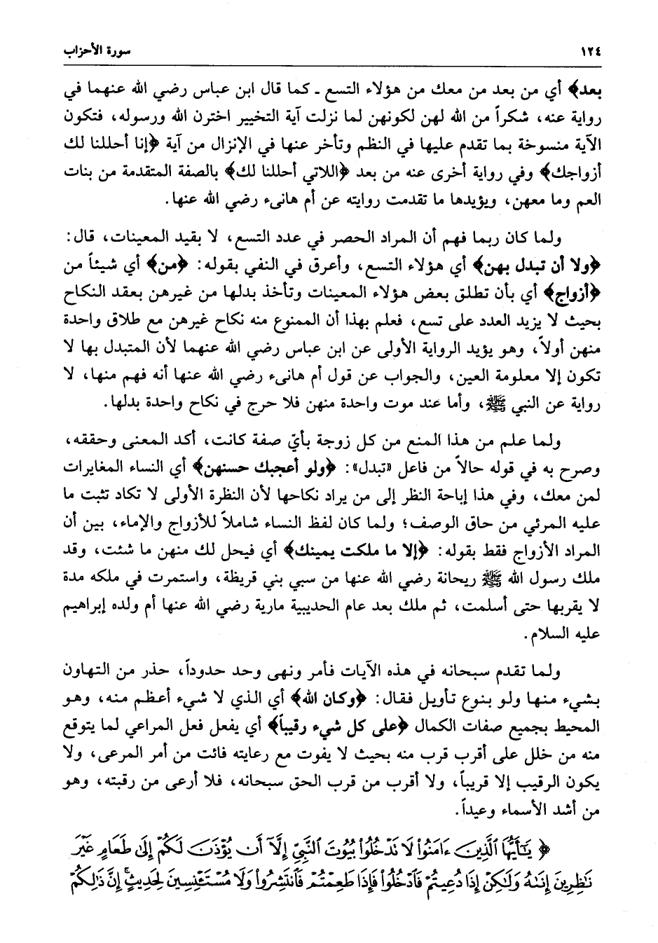 ) يأَيُّهَا الَّذِينَ آمَنُواْ لاَ تَدْخُلُواْ بُيُوتَ النَّبِيِّ إِلاَّ أَن يُؤْذَنَ لَكُمْ إِلَى طَعَامٍ غَيْرَ نَاظِرِينَ إِنَاهُ وَلَكِنْ إِذَا دُعِيتُمْ فَادْخُلُواْ فَإِذَا طَعِمْتُمْ فَانْتَشِرُواْ وَلاَ مُسْتَأْنِسِينَ لِحَدِيثٍ إِنَّ ذَلِكُمْ