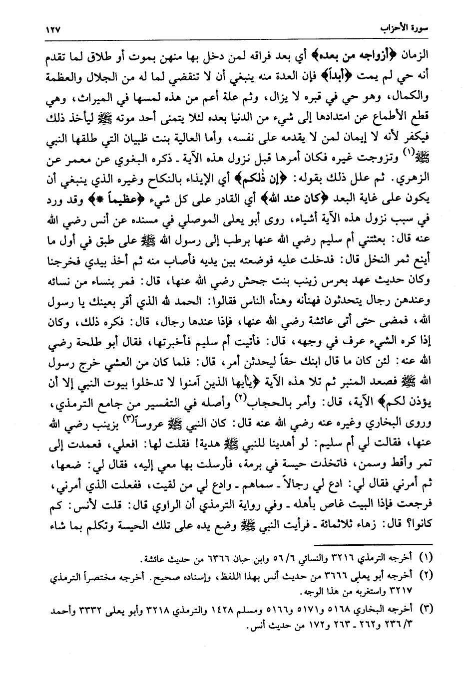 ثم علل ذلك بقوله : ( إن ذالكم ) أي الإيذاء بالنكاح وغيره الذي ينبغي أن يكون على غاية البعد ) كان الله عند ) أي القادر على كل شيء ) عظيماً ( وقج ورد في سبب نزول هذه الآية أشياء ، روى أبو يعلى الموصلي في مسنده عن أنس رضي الله عنه قال : بعثتني أم سليم رضي الله عنها برطب إلى رسول الله ( صلى الله عليه وسلم ) على طبق في أول ما أينع ثمر النخل قال : فدخلت عليه فوضعته بين يديه فأصاب منه ثم أخذ بيدي فخرجنا وكان حديث عهد بعرس زينب بنت جحش رضي الله عنها ، قال : فمر بنساء من نسائه وعندهن رجال يتحدثون فهنأنه وهنأه الناس فقالوا : الحمد لله الذي أقر بعينك يا رسول الله ، فمضى حتى أتى عائشة رضي الله عنها ، فإذا عندها رجال ، قال : فكره ذلك ، وكان إذا كره الشيء عرف في وجهه ، قال : فأتيت أم سليم فأخبرتها ، فقال أبو طلحة رضي الله عنه : لئن كان ما قال ابنك حقاً ليحدثن أمر ، قال : فكره ذلك ، وكان إذا كره الشيء عرف في وجهه ، قال : فأتيت أم سليم فأخبرتها ، فقال أبو طلحة رضي الله عنهك لئن كان ما قال ابنك حقاً ليحدثن أمر ، قال : فلما كان من العشي خرج رسول الله ( صلى الله عليه وسلم ) فصعد المنبر ثم تلا هذه الآية ) يا أيها الذين آمنوا لا تدخلوا بيوت النبي إلا أن يؤذن لكم ( الآية ، قال : وأمر الحجاب وأصله في التفسير من جامع الترمذي ، وروى البخاري وغيره عنه رضي الله عنه قال : كان النبي ( صلى الله عليه وسلم ) عروساً بزينب رضي الله عنها ، فقالت لي أم سليم : لو أهدينا للنبي ( صلى الله عليه وسلم ) هدية فقلت لها : افعلي ، فعمدت إلى تمر وأقط وسمن ، فاتخذت حيسة في برمة ، فأرسلت بها معي إليه ، فقال لي : ضعها ، ثم أمرني فقال لي : ادع لي رجالاً - سماهم - وادع لي من لقيت ، ففعلت الذي أمرني ، فرجعت فإذا البيت غاص بأهله - وفي رواية الترمذي ان الراوي قال : قلت لأنس : كم كانوا ؟ قال : زهاء ثلاثمائة - فرأيت النبي ( صلى الله عليه وسلم ) يده على تلك الحيسة وتكلم بما شاء
