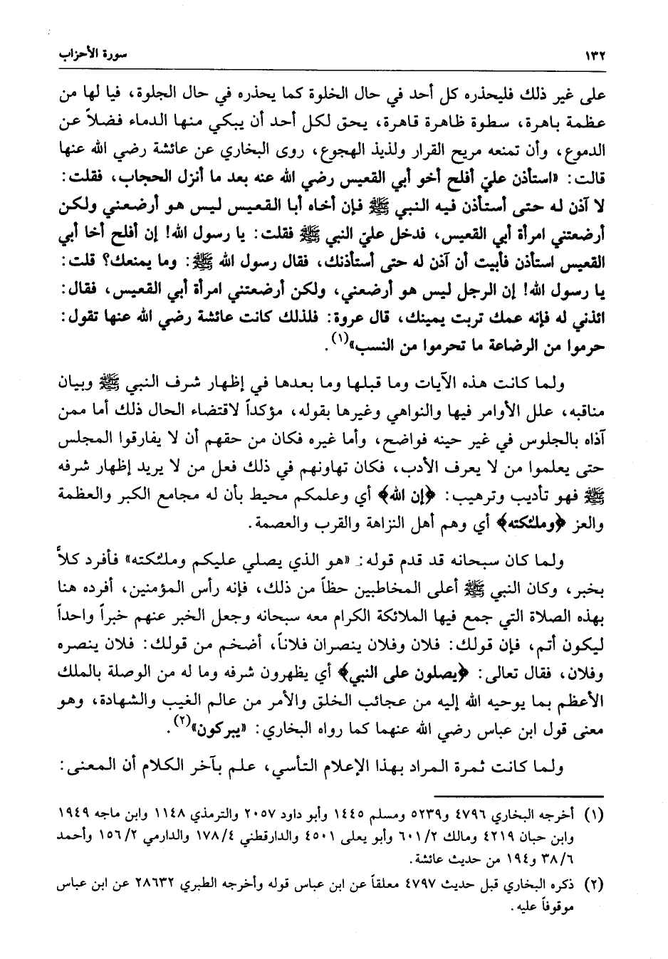 على غير ذلك فليحذوره كل أحد في حال الخلوة كما يحذره في حال الجلوة ، فبا لها من عظمة باهرة ، سطوة ظاهرة قاهرة ، يحق لكل أحد أن يبكي منها الدماء فضلاً عن الدموع ، وأن تمنعه مريع القرار ولذيذ الهجوع ، روى البخاري عن عائشة رضي الله عنها قال : ( أستأذن عليّ أفلح أخو أبي القعيس رضي الله عنه بعم ما أنزل الحجاب ، فقلت : لا آذن له حتى استأذن فيه النبي ( صلى الله عليه وسلم ) فإن أخاه أبا القعيس ليس هو أرضعني ولكن أرضعتني امرأة أبي القعيس ، فدخل عليّ النبي ( صلى الله عليه وسلم ) فقلت : يا رسول الله أفلح أخا أبي القعيس استأذن فأبيت أن آذن له حتى أستأذنك ، فقال رسول الله ( صلى الله عليه وسلم ) : وما يمنعك ؟ قلت : يا رسول الله إن الرجل ليس هو أرضعني ، ولكن أرضعتني امرأة أبي القعيس ، فقال : ائذني له فإنه عمك تربت يمينك ، قال عروة : فلذلك كانت عائشة رضي الله عنها تقول : حرموا من الرضاعة ما تحرموا من النسب ) .