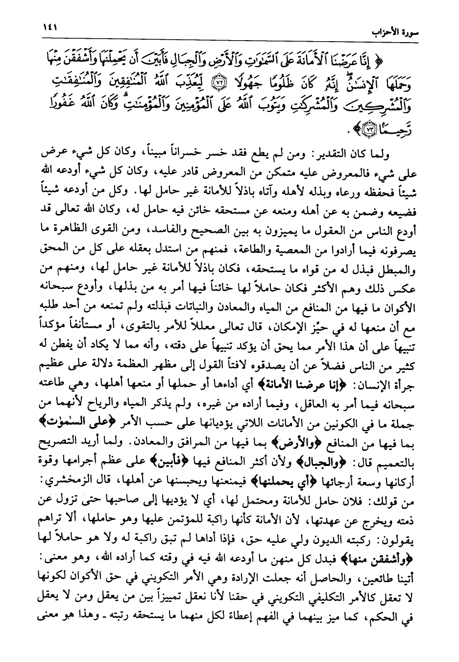 ) إِنَّا عَرَضْنَا الأَمَانَةَ عَلَى السَّمَاوَاتِ وَالأَرْضِ وَالْجِبَالِ فَأبَيْنَ أَن يَحْمِلْنَهَا وَأَشْفَقْنَ مِنْهَا وَحَمَلَهَا الإِنْسَانُ إِنَّهُ كَانَ ظَلُوماً جَهُولاً لِّيُعَذِّبَ اللَّهُ الْمُنَافِقِينَ وَالْمُنَافِقَاتِ وَالْمُشْرِكِينَ وَالْمُشْرِكَاتِ وَيَتُوبَ اللَّهُ عَلَى الْمُؤْمِنِينَ وَالْمُؤْمِنَاتِ وَكَانَ اللَّهُ غَفُوراً رَّحِيماً ( ( )