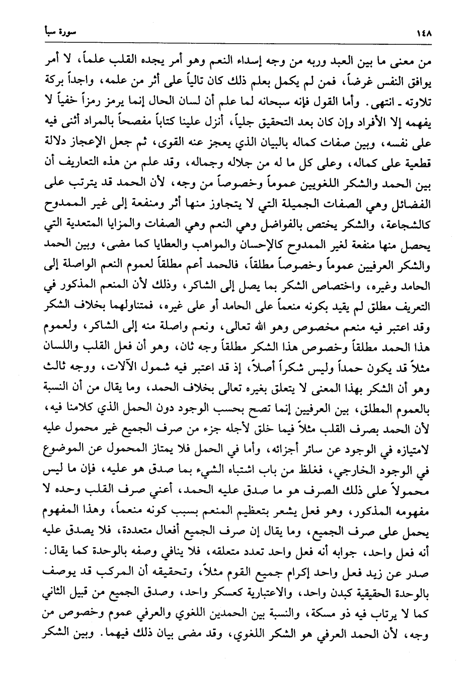 وأما القول فإنه سبحانه لما علم أن لسان الحال إنما يرمز رمزاً خفياً لا يفهمه إلا الأفراد وإن كان بعد التحقيق جلياً ، أنزل عليما كتاباً مفصحاً بالمراد أثنى فيه على نفسه ، وبين صفات كماله بالبيان الذي يعجز عنه القوى ، ثم جعل الإعجاز دلالة قطعية على كماله ، وعلى كل ما له من جلاله وجماله ، وقد علم من هذه التعاريف أن بين الحمد والشكر اللغويين عموماً وخصوصاً من وجه ، لأن الحمد قد يترتب على الفضائل وهي الصفات الجميلة التي لا يتجاوز منها أثر ومنفعة إلى غير الممدوح كالشجاعة ، والشكر يختص بالفواضل وهي النعم وهي الصفات والمزايا المتعدية التي يحصل منها منفعة لغير الممدوح كالإحسان والمواهب والعطايا كما مضى ، وبين الحمد والشكر العرفيين عموماً وخصوصاً مطلقاً ، فالحمد أعم مطلقاً لعموم النعم الواصلة إلى الحامد وغيره ، واختصاص الشكر بما يصل إلى الشاكر ، وذلك لأن المنعم المذكور في التعريف مطلق لم يقيد بكونه منعماً على الحامد أو على غيره ، فمتناولهما بخلاف الشكر وقد اعتبر فيه منعم مخصوص وهو الله تعالى ، ونعم واصلة منه إلى الشاكر ، ولعموم هذا الحمد مطلقاً وخصوص هذا الشكر مطلقاً وجه ثان ، وهو أن فعل القلب واللسان مثلاً قد يكون حمداً وليس شكراً أصلاً ، إذ قد اعتبر فيه شمول الآلات ، ووجه ثالث وهو أن الشكر بهاذ المعنى لا يتعلق بغيره تعالى بخلاف الحمد ، وما يقال من أن النسبة بالعموم المطلق ، بين العرفيين إنما تصح بحسب الوجود دون الحمل الذي كلامنا فيه ، لأن الحمد بصرف القلب مثلاً فيما خلق لأجله جزء من صرف الجميع غير محمول عن الموضوع في الوجود الخارجي ، فغلظ من باب اشتباه الشيء بما صدق هو عليه ، فإن ما ليس محمولاً على ذلك الصرف هو ما صدق عليه الحمد ، أعني صرف القلب وحده لا مفهومه المذكور ، وهو فعل يشعر بتعظيم المنعم بسبب كونه منعماً ، وهذا المفهوم يحمل على صرف الجميع ، وما يقال إن صرف الجميع أفعال متعددة ، فلا يصدق عليه أنه فعل واحد ، وما يقال إن صرف الجميع أفعال متعددة ، فلا يصدق عليه أنه فعل واحد ، جوابه أنه فعل واحد تعدد متعلقه ، فلا ينافي وصفه بالوحدة كما يقال : صدر عن زيد فعل واحد إكرام جميع القوم مثلاً ، وتحقيقه أن المركب قد يوصف بالوحدة الحقيقية كبدن واحد ، والاعتبارية كعسكر واحد ، وصدق الجميع من قبيل الثاني كما لا يرتاب فيه ذو مسكة ، والنسبة بين الحمدين اللغوي والعرفي عموم وخصوص من وجه ، لأن الحمد العرفي هو الشكر اللغوي ، وقد مضى بيان ذلك فيهما .