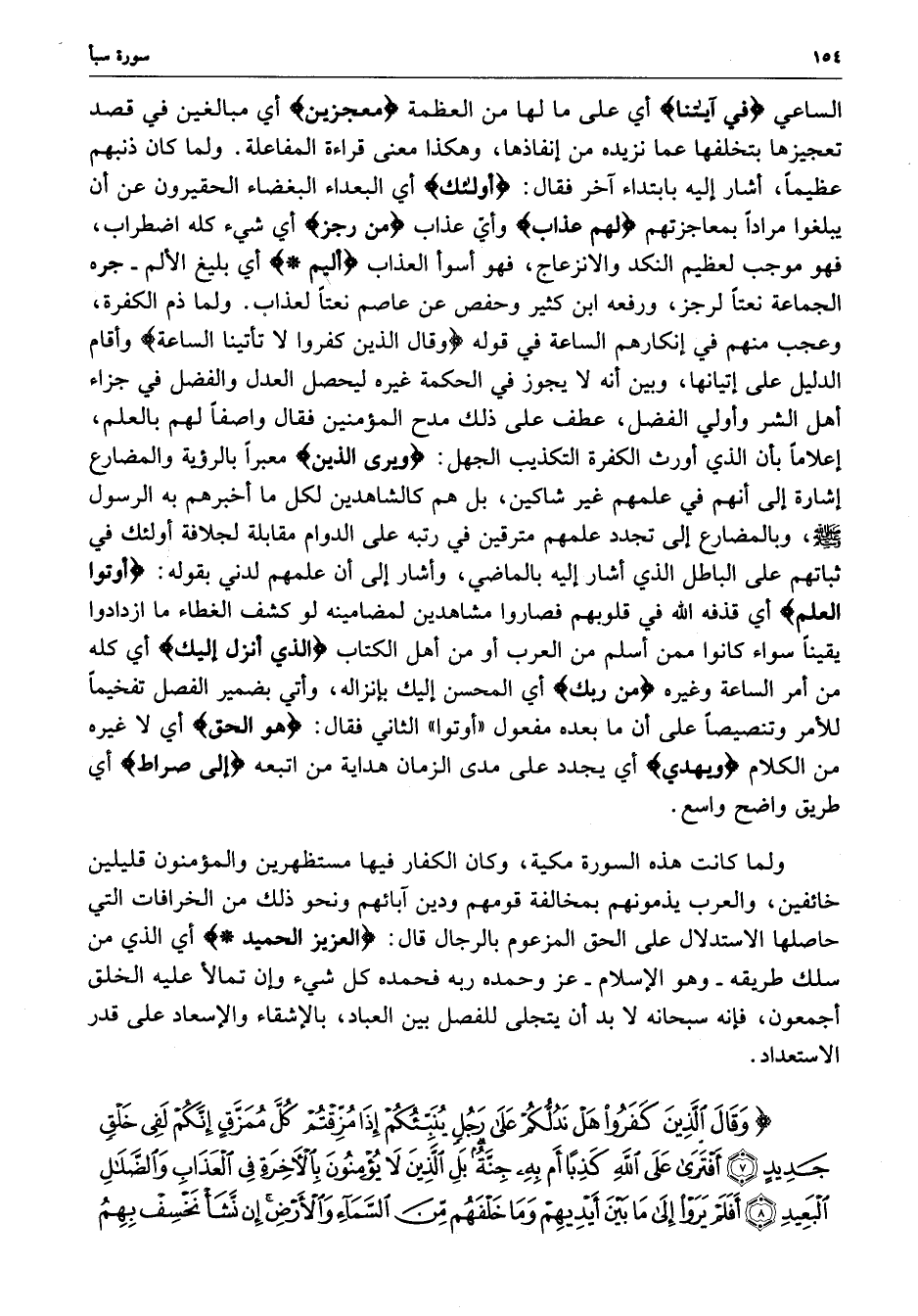 ) وَقَالَ الَّذِينَ كَفَرُواْ هَلْ نَدُلُّكُمْ عَلَى رَجُلٍ يُنَبِّئُكُمْ إِذَا مُزِّقْتُمْ كُلَّ مُمَزَّقٍ إِنَّكُمْ لَفِي خَلْقٍ جَدِيدٍ أَفْتَرَى عَلَى اللَّهِ كَذِباً أَم بِهِ جِنَّةٌ بَلِ الَّذِينَ لاَ يُؤْمِنُونَ بِالآخِرَةِ فِي الْعَذَابِ وَالضَّلاَلِ الْبَعِيدِ أَفَلَمْ يَرَوْاْ إِلَى مَا بَيْنَ أَيْدِيهِمْ وَمَا خَلْفَهُمْ مِّنَ السَّمَآءِ وَالأَرْضِ إِن نَّشَأْ نَخْسِفْ بِهِمُ