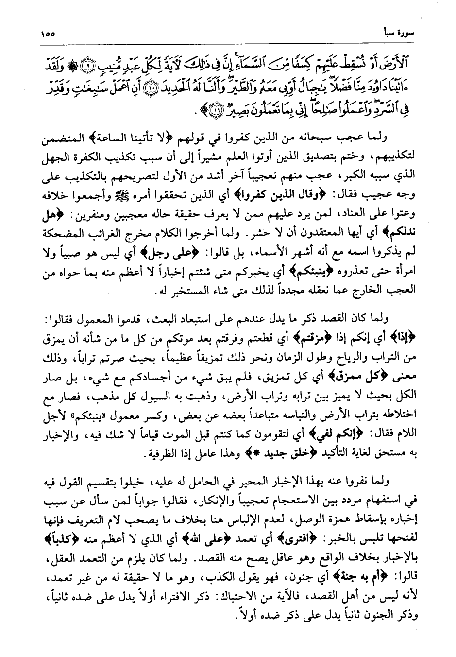 الأَرْضَ أَوْ نُسْقِطْ عَلَيْهِمْ كِسَفاً مِّنَ السَّمَآءِ إِنَّ فِي ذَلِكَ لآيَةً لِّكُلِّ عَبْدٍ مُّنِيبٍ وَلَقَدْ آتَيْنَا دَاوُودَ مِنَّا فَضْلاً يجِبَالُ أَوِّبِي مَعَهُ وَالطَّيْرَ وَأَلَنَّا لَهُ الْحَدِيدَ أَنِ اعْمَلْ سَابِغَاتٍ وَقَدِّرْ فِي السَّرْدِ وَاعْمَلُواْ صَالِحاً إِنِّي بِمَا تَعْمَلُونَ بَصِيرٌ ) 73