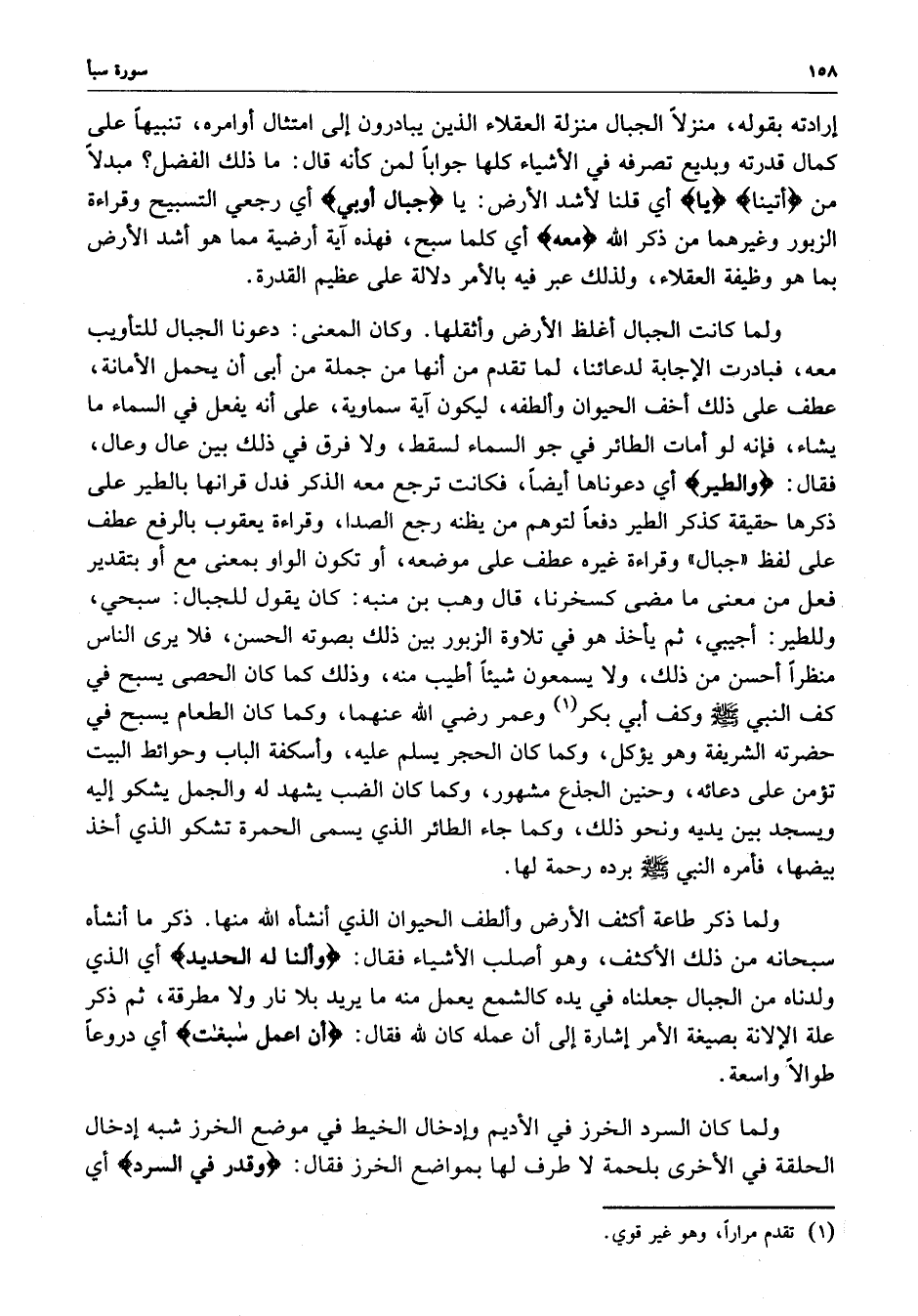إرادته بقوله ، منزلاً الجبال منزلة العقلاء الذين يبادرون إلى امتثال أوامره ، تنبيهاً على كمال قدرته وبديع تصرفه في الأشياء كلها جواباً لمن كأنه قال : ما ذلك الفضل ؟ مبدلاً من ) أتينا ( ) يا ) أي قلنا لأشد الأرض : يا ) جبال أوبي ) أي رجعي التسبيح وقراءة الزبور وغيرهما من ذكر الله ) معه ) أي كلما سبح ، فهذه آية أرضية مما هو أشد الأرض بما هو وظيفة العقلاء ، ولذلك عبر فيه بالأمر دلالة على عظيم القدرة .