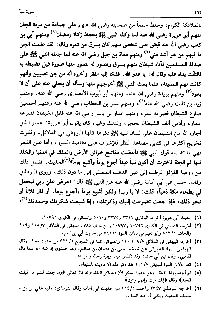 بالملائكة الكرام ، وسلط جمعاً من صحابته رضي الله عنهم على جماعة من مردة الجان منهم أبو هريرة رضي الله عنه لما وكله النبي ( صلى الله عليه وسلم ) بحفظ زكاة رمضان ومنهم أبي بن كعب رضي الله عنه قبض على شخص منهم كان يسرق من تمره وقال : لقد علمت الجن ما فيهم من هو أشد مني ومنهم معاذ بن جبل رضي الله عنه لما جعله النبي ( صلى الله عليه وسلم ) على صدقة المسلمين فأتاه شيطان منهم يسرق وتصور له بصور منها صورة فيل فضبطه به فالتفّت يداه عليه وقال له : يا عدو الله ، فشكا إليه فقره وأخبره أنه من جن نصيبين وأنهم كانت لهم المدينة ، فلما بعث النبي ( صلى الله عليه وسلم ) أخرجهم منها وسأله أن يخلي عنه على أن لا يعود ومنهم بريدة رضي الله عنه ، ومنهم أبو أيوب الأنصاري ضي الله عنه ، ومنهم زيد بن ثابت رضي الله عنه ، ومنهم عمر بن الخطاب رضي الله عنه وعنهم أجمعين صارع الشيطان فصرعه عمر ، ومنهم عمار بن ياسر رضي الله عنه قاتل الشيطان فصرعه عمار ، وأدمى أنف الشيطان بحجر ، ولذلك وغيره كان يقول أبو هريرة : عمار الذي أجاره الله من الشيطان على لسان نبيه ( صلى الله عليه وسلم ) ذكرها كلها البهيقي في الدلائل ، وذكرت تخريج أكثرها في كتابي مصاعد النظر للإشراف على مقاصد السور ، وأما عيم القطر فهي ما تضمنه قول النبي ( صلى الله عليه وسلم ) ( أعطيت مفاتيح خزائن الأرض والملك في الدنيا والخلد فيها ثم الجنة فاخترت أن أكون نبياً عبداً أجوع يوماً وأشبع يوماً ) الحديث ، فشمل ذلك من روضة اللؤلؤ الرطب إلى عين الذهب المصفى إلى ما دون ذلك ، وروى الترمذي وقال : حسن عن أبي أمامة رضي الله عنه عن النبي صلى الله عليه قال : ( عرض عليّ ربي ليجعل لي بطحاء مكة ذهباً ، قلت : لا يارب ولكن أشبع يوماً وأجوع يوماً ، أو قال ثلاثاً أو نحو ذلك ، فإذا جعت تضرعت إليك وذكرتك ، وإذا شبعت شكرتك وحمدتك )