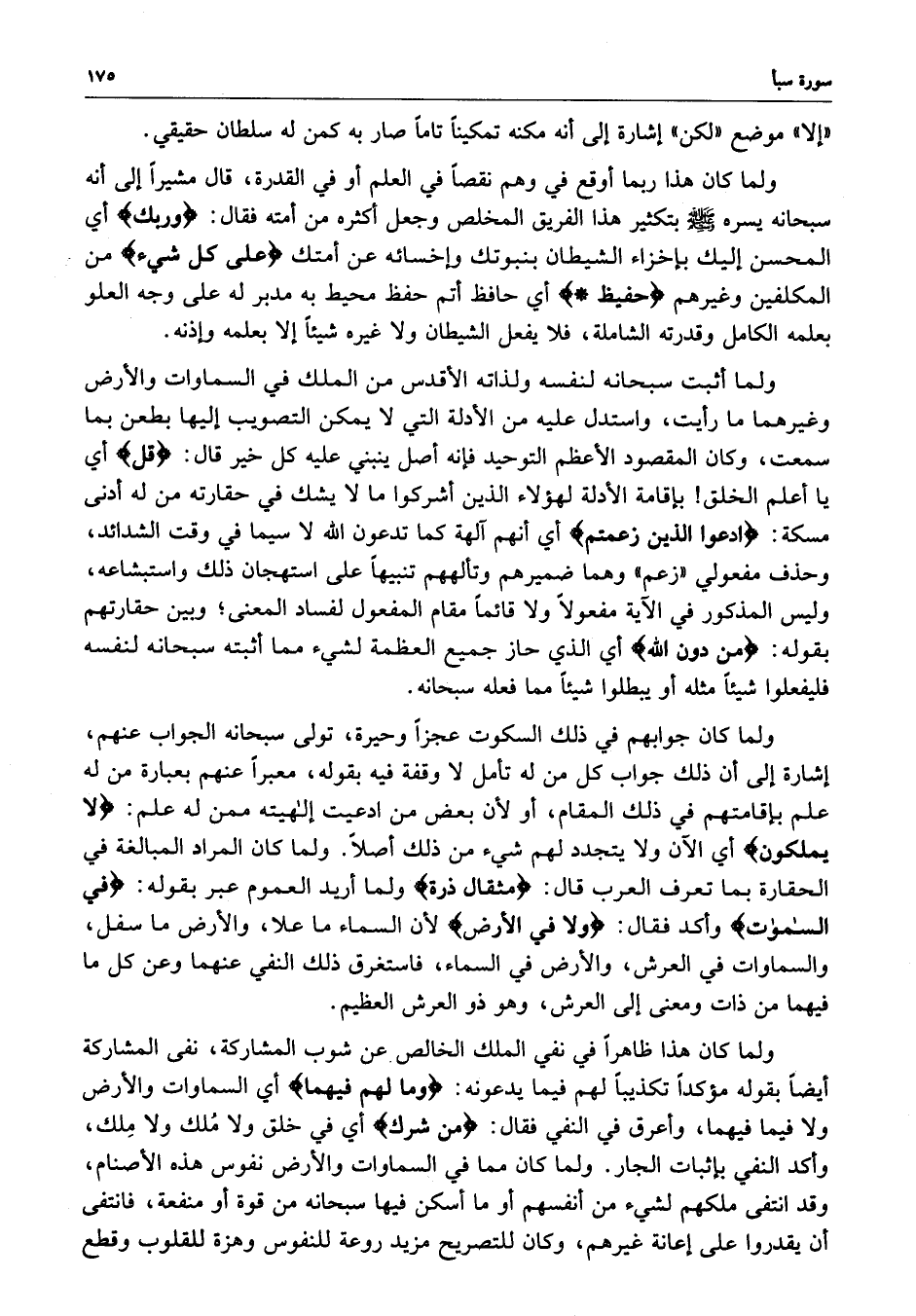 ولما كان المراد المبالغة في الحقارة بما تعرف العرب قال : ( مثقال ذرة ( ولما أريد العموم عبر بقوله : ( في السموات ( وأكد فقال : ( ولا في الأرض ( لأن السماء ما علا ، والأرض ما سفل ، والسماوات في العرش ، والأرض في السماء ، فاستغرق ذلك النفي عنهما وعن كل ما فيهما من ذات ومعنى إلى العرش ، وهو ذو العرش العظيم .