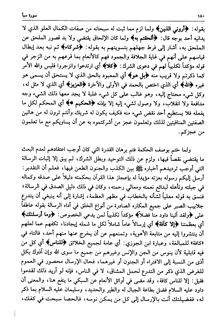 ولما ختم بوصف الحكمة فتم برهان القدرة التي كان أوجب اعتقادهم لعدم البعث ما يقتضي نقضاً فيها ، ولزم عن ذلك التوحيد وبطل الشرك ، لم يبق إلا إثبات الرسالة التي أوجب ترديدهم أخباره ( صلى الله عليه وسلم ) بين الكذب والجنون الطعن فيها ، فعلم أن التقدير : أرسل إليكم رسوله بعزته مؤيداً له بإعجاز هذا القرآن بحكمته دليلاً على صدقه وكماله في جبلته وتأهله لبدائع نعمته ومعالي رحمته ، وكان في ذلك دليل الصدق في الرسالة ؛ فنسق به قوله معلياً لشأنه بالخطاب في مظهر العظمة ، إشارة إلى أنه ينبغي أن يتدرع جلابيب الصبر على جميع المكارة الصادرة من أنواع الخلق في أداء الرسالة بقوله عاطفاً على ) ولقد آتينا داود فضلاً ( مؤكداً تكذيباً لمن يدعي الخصوص : ( وما أرسلناك ) أي بعظمتنا ) إلا كآفة ) أي إرسالاً عاماً شاملاً لكل ما شمله إيجادنا ، تكفهم عما لعلهم أن ينتشروا إليه من متابعة الأهوية ، وتمنعهم عن أن يخرج عنها منهم أحد ، فالتاء في ( كافة ) للمبالغة ، وعبارة ابن الجوزي : أي عامة لجميع الخلائق ) للناس ) أي كل من فيه قابلية لأن ينوس من الجن والإنس وغيرهم من جميع ما سوى الله وإن آذوك بكل أذى من النسبة إلى الافتراء أو الجنون أو غيرهما ، فحال الإرسال محصور في العموم للغرض الذي ذكر من التدرع لحمل المشاق ، لا في الناس ، فأنه لو أريد ذلك لقدموا فقيل : إلا الناس كافة ، وقد مضى فب أوائل الأنعام عن السبكي ما ينفع هنا ، والمعنى أن داود عليه السلام فضل بطاعة الجبال له والطير والحديد ، وسليمان عليه السلام بما ذكر له ، ففضيلتك أنت بالإرسال إلى كل من يمكن نوسه ، فالحصا سبحت في كفك ،