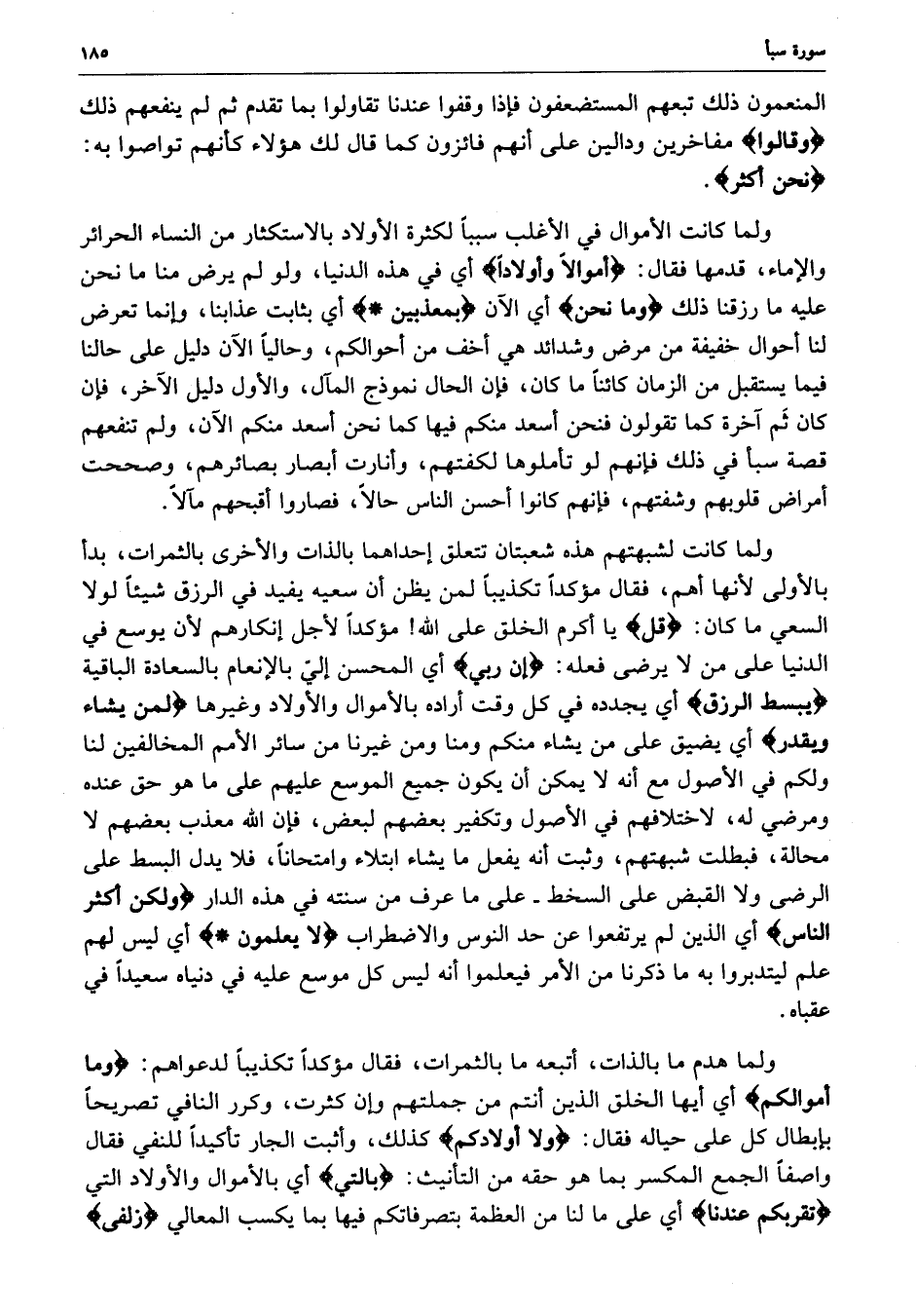 المنعمون ذلك تبعهم المستضعفون فإذا وقفوا عندنا تقالوا بما تقدم ثم لم ينفعهم ذلك ) وقالوا ( مفاخرين ودالين على أنهم فائزون كما قال لك هؤلاء كأنهم تواصلوا به : ولما كانت الأموال في الأغلب سبباً لكثرة الأولاد بالاستكثار من النساء الحرائر والإماء ، قدمها فقال : ( أموالاً وأولاداً ) أي في هذه الدنيا ، ولو لم يرض منا ما نحن عليه ما رزقنا ذلك ) وما نحن ) أي الآن ) بمعذبين ) أي بثابت عذابنا ، وإنما تعرض لنا أحوال خفيفة من مرض وشدائد هي أخف من أحوالكم ، وحالياً الآن دليل على حالنا فيما يستقبل من الزمان كائناً ما كان ، فإن الحال نموذج المآل ، والأول دليل الآخر ، فإن كان ثّم آخرة كما تقولون فنحن أسعد منكم فيها كما نحن أسعد منكم الآن ، ولم تنفعهم قصة سبأ في ذلك فإنهم لو تأملوا لكفتهم ، وأنارت أبصار بصائرهم ، وصححت أمراض قلوبهم وشفتهم ، فإنهم كانوا أحسن الناس حالاً ، فصاروا أقبحهم مآلاً .