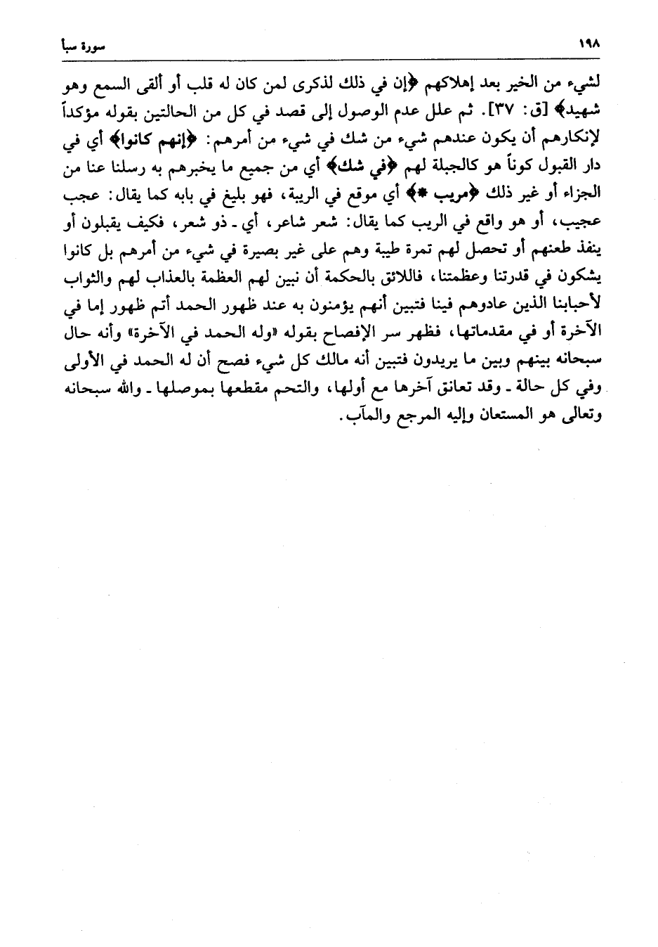 لشيء من الخير بعد إهلاكهم ) إن في ذلك لذكرى لمن كان له قلب أو ألقى السمع وهو شهيد ) [ ق : 37 ] ثم علل عدم الوصول إلى قصد يفي كل من الحالتين بقوله مؤكدا لأنكارهم أن يكون عندهم شيء من شك يفي شيء من أمرهم : ( إنهم كانوا ) أي في دار القبول كونا هو كالجبلة لهم ) في شك ) أي من جميع ما يخبرهم به رسلنا عنا من دار القبول كونا هو كالجبلة لهم ) في شك ) أي من جميع ما يخبرهم به رسلنا عنا من الجزاء أو غير ذلك ) مريب ) أي موقع في الريبة ، فهو بليغ في بابه كما يقال : عجب عجيب ، أو هو واقع يفي الريب كما يقال : شعر شاعر ، أي ذو شعر ، فكيف يقبلون أو ينفذ طعنهم أو تحصل لهم تمرة طيبة وهم على غير بصيرة في شيء من أمرهم بل كانوا يشكون في قدرتنا وعظمتنا ، فاللائق بالحكمة أن تبين لهم العظمة بالعذاب لهم والصواب لأحباننا الذين عاودهم فينا فنبين أنهم يؤمنون به عند ظهور الحمد أتم إما في الآخرة أو في مقدماتها ، فظهر سر الإفصاح بقوله " وله الحمد في الآخرة " وأنه حال سبحانه بينهم وبين ما يريدون فتبين أنه مالك كل شيء فصح أن له الحمد في الأولى وفي كل حالة ، وقد تعانق آخرها مع أولها ، والتحم مقطعها بموصلها - والله سبحانه وتعالى هو المستعان وإليه المرجع والمآب. .. . .