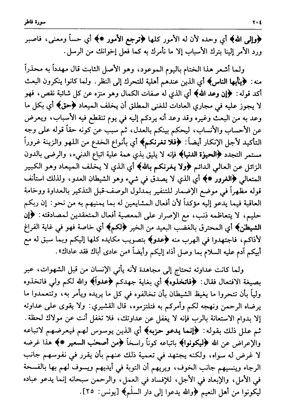 ولما كانوا ينكرون البعث أكد قوله : ( إن وعد الله ) أي الذي له صفات الكمال وهو منزه عن كل شائبة نقص ، فهو لا يجوز عليه في مجاري العادات للغنى المطلق أن يخلف الميعاد ) حق ) أي بكل ما وعد به من البعث وغيره وقد وعد أنه يردكم إليه في يوم تنقطع فيه الأسباب ، ويعرض عن الأحساب والأنساب ، ليحكم بينكم بالعدل ، ثم سبب عن كونه حقاً قوله على وجه التأكيد لأجل الإنكار أيضاً : ( فلا تغرنكم ) أي بأنواع الخدع من اللهو والزينة غروراً مستمر التجدد ) الحياة الدنيا ( فإنه لا يليق بذي همه عليه اتباع الدنيء ، والرضى بالدون الزائل عن العالي الدائم ) ولا يغرنكم بالله ) أي الذي لا يخلف الميعاد وهو الكبير المتعالي ) الغرور ) أي الذي لا يصدق في شيء وهو الشيطان العدو ، ولذلك استأنف قوله مظهراً في موضع الإضمار للتنفير بمدلول الوصف قبل التذكير بالعداوة ووخامة العاقبة فيما يدعو إليه مؤكداً لأن أفعال المشايعين له بما يمنيهم به من نحو : إن ربكم حليم ، لا يتعاظمه ذنب ، مع الإصرار على المعصية أفعال المتعقدين لمصادقته : ( إن الشيطان ) أي المحترق بالغضب البعيد من الخير ) لكم ) أي خاصة غهو في غاية الفراغ لأذاكم ، فاجتهدوا في الهرب منه ) عدو ( بتصويب مكايده كلها إليكم وبما سبق له مع أبيكم آدم عليه السلام بما وصل أذاه إليكم وأيضاً ( من عادى أباك فقد عاداك ) .