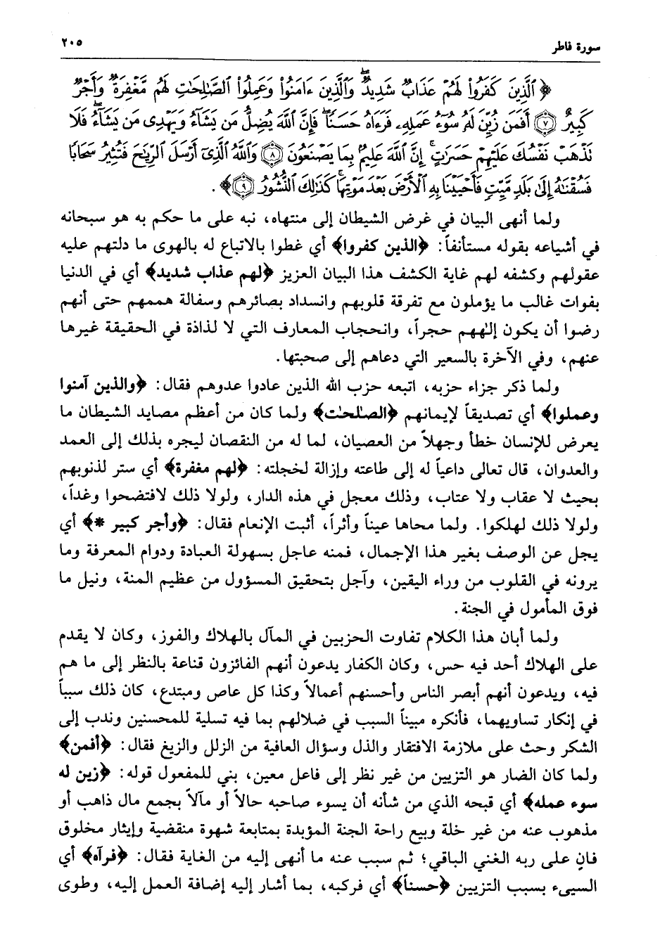 ) الَّذِينَ كَفَرُواْ لَهُمْ عَذَابٌ شَدِيدٌ وَالَّذِينَ آمَنُواْ وَعَمِلُواْ الصَّالِحَاتِ لَهُم مَّغْفِرَةٌ وَأَجْرٌ كَبِيرٌ أَفَمَن زُيِّنَ لَهُ سُوءَ عَمَلِهِ فَرَآهُ حَسَناً فَإِنَّ اللَّهَ يُضِلُّ مَن يَشَآءُ وَيَهْدِي مَن يَشَآءُ فَلاَ تَذْهَبْ نَفْسُكَ عَلَيْهِمْ حَسَرَاتٍ إِنَّ اللَّهَ عَلِيمٌ بِمَا يَصْنَعُونَ وَاللَّهُ الَّذِي أَرْسَلَ الرِّيَاحَ فَتُثِيرُ سَحَاباً فَسُقْنَاهُ إِلَى بَلَدٍ مَّيِّتٍ فَأَحْيَيْنَا بِهِ الأَرْضَ بَعْدَ مَوْتِهَا كَذَلِكَ النُّشُورُ ( ( )