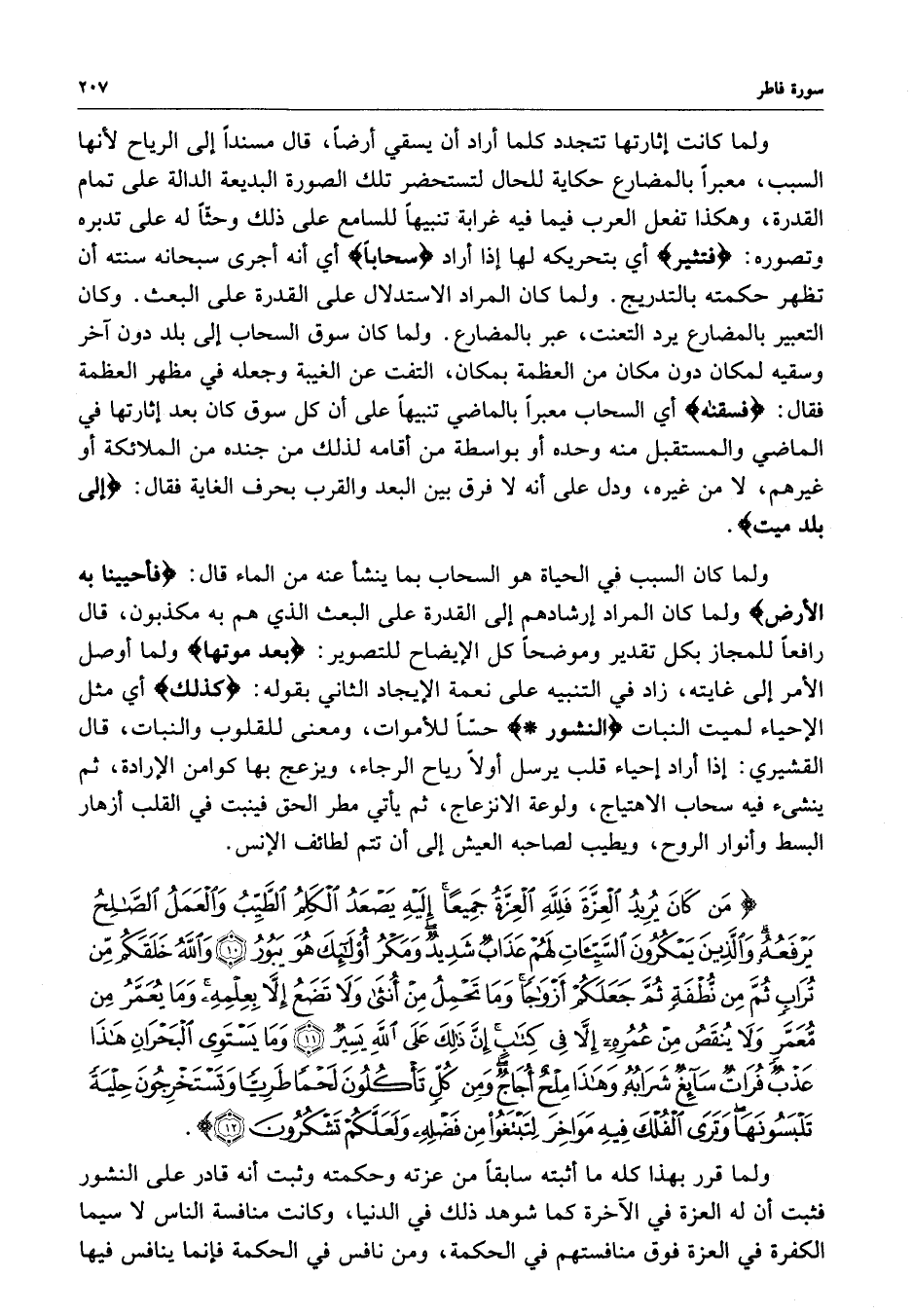 ) مَن كَانَ يُرِيدُ الْعِزَّةَ فَلِلَّهِ الْعِزَّةُ جَمِيعاً إِلَيْهِ يَصْعَدُ الْكَلِمُ الطَّيِّبُ وَالْعَمَلُ الصَّالِحُ يَرْفَعُهُ وَالَّذِينَ يَمْكُرُونَ السَّيِّئَاتِ لَهُمْ عَذَابٌ شَدِيدٌ وَمَكْرُ أُوْلَئِكَ هُوَ يَبُورُ وَاللَّهُ خَلَقَكُمْ مِّن تُرَابٍ ثُمَّ مِن نُّطْفَةٍ ثُمَّ جَعَلَكُمْ أَزْوَاجاً وَمَا تَحْمِلُ مِنْ أُنْثَى وَلاَ تَضَعُ إِلاَّ بِعِلْمِهِ وَمَا يُعَمَّرُ مِن مُّعَمَّرٍ وَلاَ يُنقَصُ مِنْ عُمُرِهِ إِلاَّ فِي كِتَابٍ إِنَّ ذَلِكَ عَلَى اللَّهِ يَسِيرٌ وَمَا يَسْتَوِي الْبَحْرَانِ هَذَا عَذْبٌ فُرَاتٌ سَآئِغٌ شَرَابُهُ وَهَذَا مِلْحٌ أُجَاجٌ وَمِن كُلٍّ تَأْكُلُونَ لَحْماً طَرِيّاً وَتَسْتَخْرِجُونَ حِلْيَةً تَلْبَسُونَهَا وَتَرَى الْفُلْكَ فِيهِ مَوَاخِرَ لِتَبْتَغُواْ مِن فَضْلِهِ وَلَعَلَّكُمْ تَشْكُرُونَ ( ( )