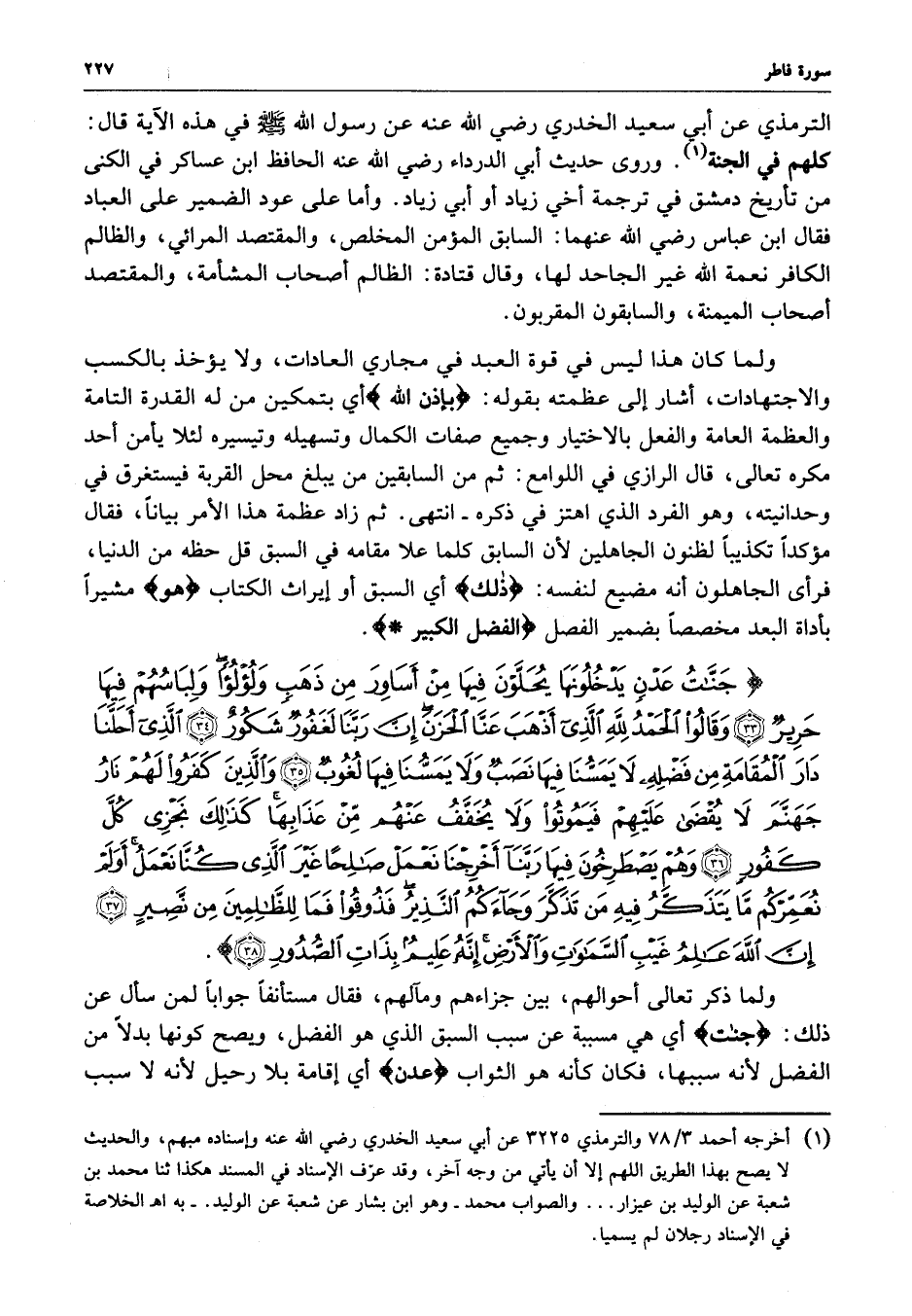 ) جَنَّاتُ عَدْنٍ يَدْخُلُونَهَا يُحَلَّوْنَ فِيهَا مِنْ أَسَاوِرَ مِن ذَهَبٍ وَلُؤْلُؤاً وَلِبَاسُهُمْ فِيهَا حَرِيرٌ وَقَالُواْ الْحَمْدُ للَّهِ الَّذِي أَذْهَبَ عَنَّا الْحَزَنَ إِنَّ رَبَّنَا لَغَفُورٌ شَكُورٌ الَّذِي أَحَلَّنَا دَارَ الْمُقَامَةِ مِن فَضْلِهِ لاَ يَمَسُّنَا فِيهَا نَصَبٌ وَلاَ يَمَسُّنَا فِيهَا لُغُوبٌ وَالَّذِينَ كَفَرُواْ لَهُمْ نَارُ جَهَنَّمَ لاَ يُقْضَى عَلَيْهِمْ فَيَمُوتُواْ وَلاَ يُخَفَّفُ عَنْهُمْ مِّنْ عَذَابِهَا كَذَلِكَ نَجْزِي كُلَّ كَفُورٍ وَهُمْ يَصْطَرِخُونَ فِيهَا رَبَّنَآ أَخْرِجْنَا نَعْمَلْ صَالِحاً غَيْرَ الَّذِي كُنَّا نَعْمَلُ أَوَلَمْ نُعَمِّرْكُمْ مَّا يَتَذَكَّرُ فِيهِ مَن تَذَكَّرَ وَجَآءَكُمُ النَّذِيرُ فَذُوقُواْ فَمَا لِلظَّالِمِينَ مِن نَّصِيرٍ إِنَّ اللَّهَ عَالِمُ غَيْبِ السَّمَاوَاتِ وَالأَرْضِ إِنَّهُ عَلِيمٌ بِذَاتِ الصُّدُورِ ( ( )