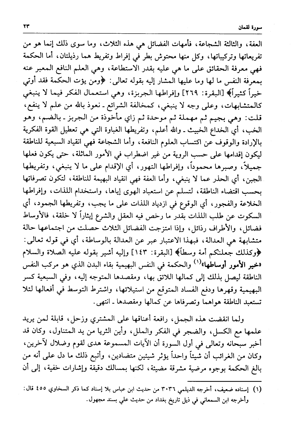 [ البقرة : 269 ] وإفراطها الجزبرة ، وهي استعمال الفكر فيما لا ينبغي كالمتشابهات ، وعلى وجه لا ينبغي ، كالمخالفة الشرائع - نعوذ بالله من علم لا ينفع قلت : وهي بجيم ثم مهملة ثم موحدة ثم زاي مأخوذة من الجزبر - بالضم ، وهو الخب ، أي الخداع الخبيث - والله اعلم ، وتفريطها الغباوة التي هي تعطيل القوة الفكرية بالإرداة والوقوف على اكتساب العلوم النافعة ، وأما الشجاعة فيه انقياد السبعية للناطقة ليكون إقدامها على حسب الروية من غير اضطراب في الأمور الماثلة ، حتى يكون فعلها جميلاً ، وصبرها محموداً ، وإفراطها التهور ، أي الإقدام على ما ينبغي ، وتفريطها الجبن ، أي الحذر عما لا ينبغي ، وأما العفة فهي انقياد البهيمة للناطقة ، لتكون تصرفاتها بحسب اقتضاء الناطقة ، لتسلم عن استبعاد الهوى إياها ، واستخدام اللذات ، وإفراطها الخلاعة والفجور ، أي الوقوع في ازدياد اللذات على ما يجب ، وتفريطها الجمود ، أي السكوت عن طلب الذات بقدر ما رخص فيه العقل والشرع إيثاراً لا خلقة ، فالأوساط فضائل ، والأطراف رذائل ، وإذا امتزجت الفضائل الثلاث حصلت من اجتماعها حالة فضائل ، والأطراف رذائل ، وإذا امتزجت الفضائل الثلاث حصلت من اجتماعها حالة متشابهة هي العدالة ، فبهذا الاعتبار عبر عن العدالة بالوساطة ، أي في قوله تعالى :