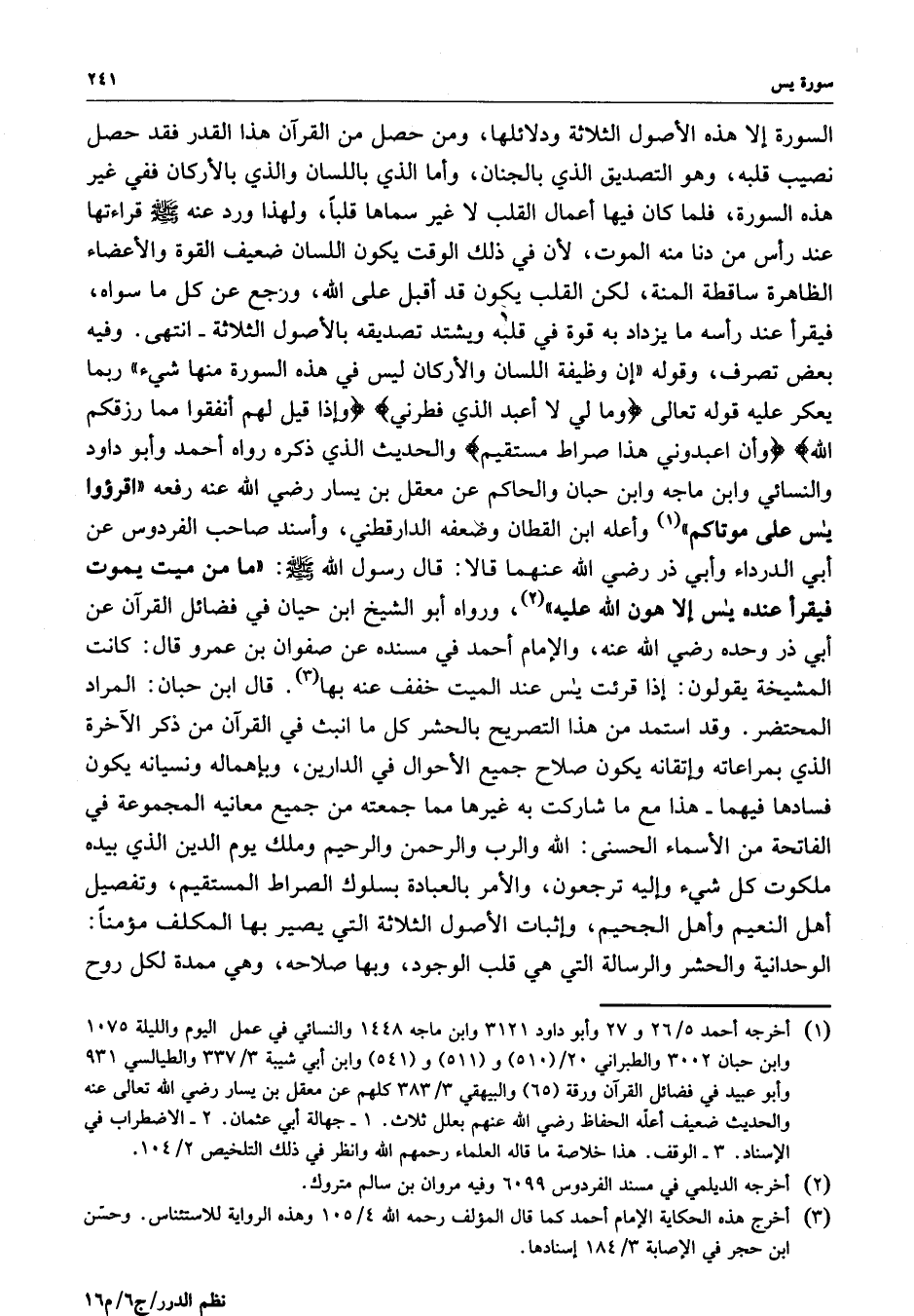 السورة إلا هذه الأصول الثلاثة ودلائلها ، ومن حصل من القرآن أن هذا القدرلا فقد حصل نصيب فلبه ، وهو التصديق الذي بالجنان ، وأما الذي باللسان والذي بالأركان ففي غير هذه السورة ، فلما كان فيها أعمال القلب لاغير سماها قلبا ولهذا ورد عنه ( صلى الله عليه وسلم ) قراءتها عند رأس من دنا منه الموت ، لأن في ذلك الوقت يكون اللسان ضعيف القوة والأعضاء الظاهرة ساقطة المنة ، لكن القلب يكون قد أقبل على الله ، ورجع عن كل ما سواه ، فيقرأ عند رأسه ما يزداد به قوة في قلبه ويشتد تصديقه بالأصول الثلاثة - انتهى. وفيه بعض تصرف ، وقوله " إن وظيفة اللسان والأركان ليس في هذه السورة منها شيء " ربما بعكر عليه قوله تعالى ) وما لي لا أعبد الذي فطرني ( ) وإذا قيل لهم أنفقوا مما رزقكم الله ( ) وأن اعبدوني هذا صراط مستقيم ( والحديث الذي ذكره رواه أحمد وأبو داود والنسائي وابن ماجه وابن حبان والحاكم عن معقل بن يسار رضي الله عنه رفعه " اقرؤوا يس على موتاكم " وأ " له ابن القطان وضعفه الدارقطني ، وأسند صاحب الفردوس عن أبي الدرداء وأبي ذر وحده رضي الله عنه ، والإمام أحمد في مسنده عن صفوان بن عمرو قال : كانت المشيخة يقولون : إذا قرئت يس عند الميت خفف عنه بها. قال ابن حبان : المراد المحتضر. واستمد من هذا التصريح بالحشر كل ما انبث في القرآن من ذكر الآخرة الذي بمراعاته وإتقانه يكون صلاح جميع الأحوال في الدارين ، وبإهماله ونسيانه يكون فسادها فيهما - هذامع ما شاركت به غيرها مما جمعتهمن جميع معانيه المجموعة يفي الفاتحة من الأسماء الحسنى : الله والرب والرحمن والرحيم وملك يوم الدين الذي بيده ملكوت كل شيء وإليه ترجعون ، والأمر بالعبادة بسلوك الصراط المستقيم ، وتفضيل أهل النعيم وأهل الجحيم ، وإثبات الأصول الثلاثة التي يصير بها المكلف مؤمنا : الوحدانية والحشر والرسالة التي هي قلب الوجود ، وبها صلاحه ، وهي ممدة لكل روح