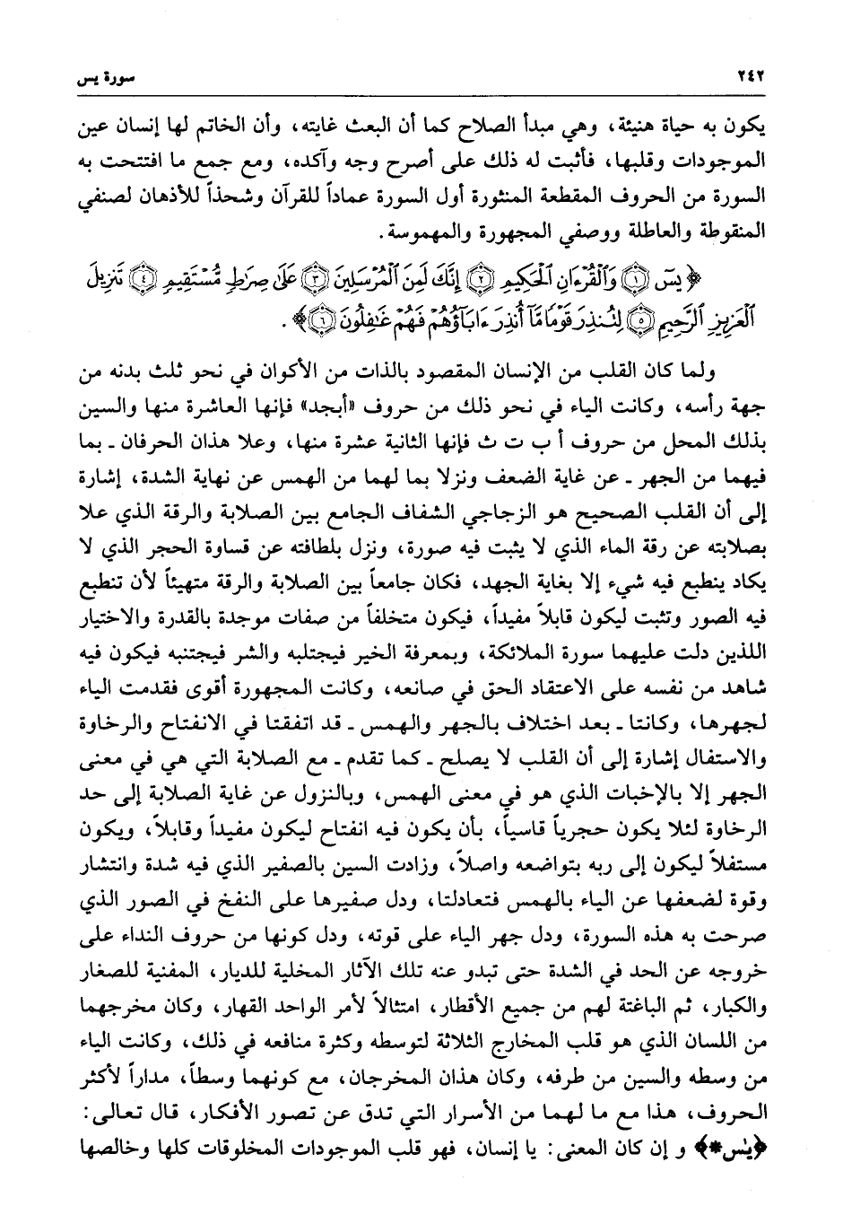 ولما كان القلب من الإنسان المقصود بالذات من الأكوان في نحو ثلث بدنه من جهة رأسه ، وكانت الياء في نحو ذلك من حروف ( أبجد ) فإنها العاشرة منها والسين بذلك المحل من حروف أ ب ت ث فإنها الثانية عشرة منها ، وعلا هذان الحرفان - بما فيهما من الجهر - عن غاية الضعف ونزلا بما لهما من الهمس عن نهاية الشدة ، إشارة إلى أن القلب الصحيح هو الزجاجي الشفاف الجامع بين الصلابة والرقة الذي علا بصلابته عن رقة الماء الذي لا يثبت فيه صورة ، ونزل بلطافته عن قساوة الحجر الذي لا يكاد ينطبع فيه شيء إلا بغاية الجهد ، فكان جامعاً بين الصلابة والرقة متهيئاً لأن تنطبع فيه الصور وتثبت ليكون قابلاً مفيداً ، فيكون متخلفاً من صفات موجدة بالقدرة والاختيار اللذين دلت عليهما سورة الملائكة ، وبمعرفة الخير فيجتلبه والشر فيجتنبه فيكون فيه شاهد من نفسه على الإعتقاد الحق في صانعه ، وكانت المهجورة أقوى فقدمت الياء لجهرها ، وكانتا - بعد اختلاف بالجهر والهمس - قد اتفقتا في الانفتاح والرخاوة والاستفال إشارة إلى أن القلب لا يصلح - كما تقدم - مع الصلابة التي هي في معنى الجهر إلا بالإخبات الذي هو في معنى الهمس ، وبالنزول عن غاية الصلابة إلى حد الرخاوة لئلا يكون إلى ربه بالهمس فتعادلتا ، ودل كونها من حروف النداء على خروجه عن الحد في الشده حتى تبدو عنه تلك الآثار المخلية للديار ، المنفية للصغار والكبار ، ثم الباغتة لهم من جميع الأقطار ، امتثالاً لأمر الواحد القهار ، وكان مخرجهما من اللسان الذي هو قلب المخارج الثلاثة لتوسطه وكثرة منافعه في ذلك ، وكانت الياء من وسطه والسين من طرفه ، وكان هذان المخرجان ، مع كونهما وسطاً ، مداراً لأكثر الحروف ، هذا مع ما لهما من الأسرار التي تدق عن تصور الأفكار ، قال تعالى : ( يس ( وإن كان المعنى : يا إنسان ، فهو قلب الموجودات المخلوقات كلها وخالصها