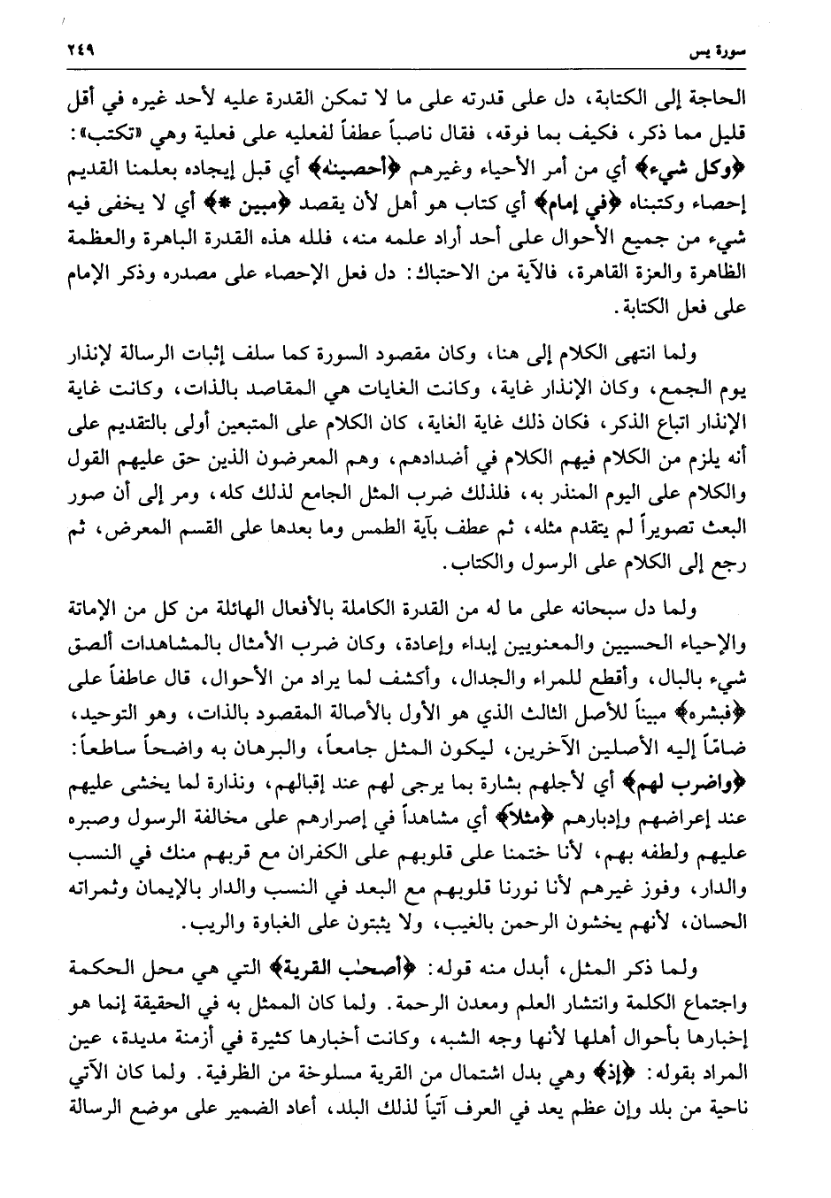 الحاجة إلى الكتابة ، دل على قدرته على ما لا تمكن القدرة عليه لأحد غيره في أقل قليل مما ذكر ، فكيف بما فوقه ، فقال ناصباً عطفاً لفعليه وهي ( تكتب ) : ( وكل شيء ) أي من أمر الأحياء وغيرهم ) أحصيناه ) أي قبل إيجاده بعلمنا القديم إحصاء وكتبناه ) في إمام ) أي كتاب هو أهل لأن يقصد ) مبين ) أي لا يخفى فيه شيء من جميع الأحوال على أحد أراد علمه منه ، فلله ههذ القدرة الباهرة والعظمة الظاهرة والعزة القاهرة ، فالآية من الاحتباك : دل فعل الإحصاء على مصدره وذكر الإمام على فعل الكتابة .