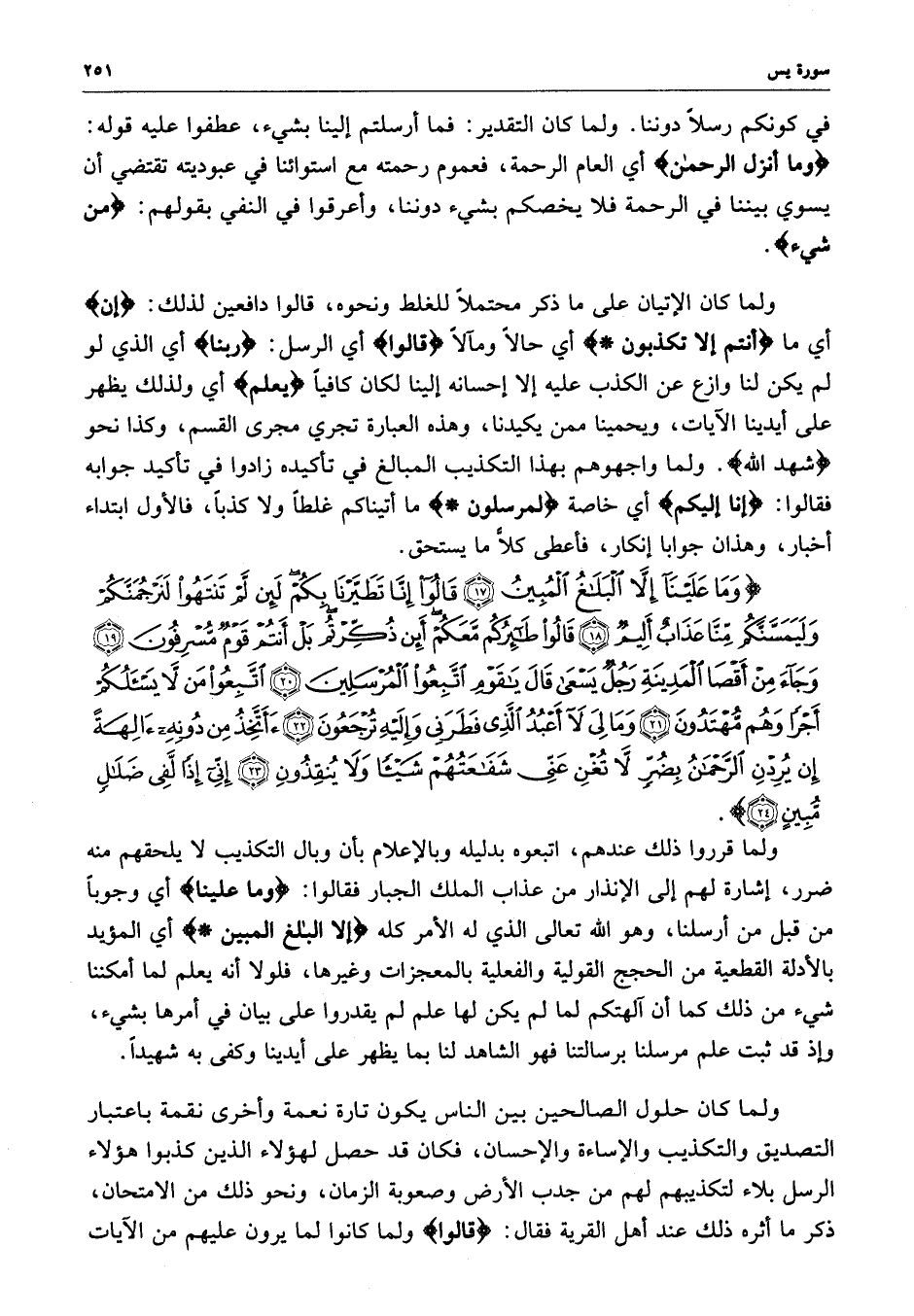 ) وَمَا عَلَيْنَآ إِلاَّ الْبَلاَغُ الْمُبِينُ قَالُواْ إِنَّا تَطَيَّرْنَا بِكُمْ لَئِن لَّمْ تَنتَهُواْ لَنَرْجُمَنَّكُمْ وَلَيَمَسَّنَّكُمْ مِّنَّا عَذَابٌ أَلِيمٌ قَالُواْ طَائِرُكُم مَّعَكُمْ أَإِن ذُكِّرْتُم بَلْ أَنتُمْ قَوْمٌ مُّسْرِفُونَ وَجَآءَ مِنْ أَقْصَى الْمَدِينَةِ رَجُلٌ يَسْعَى قَالَ يقَوْمِ اتَّبِعُواْ الْمُرْسَلِينَ اتَّبِعُواْ مَن لاَّ يَسْأَلُكُمْ أَجْراً وَهُمْ مُّهْتَدُونَ وَمَا لِيَ لاَ أَعْبُدُ الَّذِي فَطَرَنِي وَإِلَيْهِ تُرْجَعُونَ أَأَتَّخِذُ مِن دُونِهِ آلِهَةً إِن يُرِدْنِ الرَّحْمَنُ بِضُرٍّ لاَّ تُغْنِ عَنِّي شَفَاعَتُهُمْ شَيْئاً وَلاَ يُنقِذُونَ إِنِّي إِذاً لَّفِي ضَلاَلٍ مُّبِينٍ ( ( )