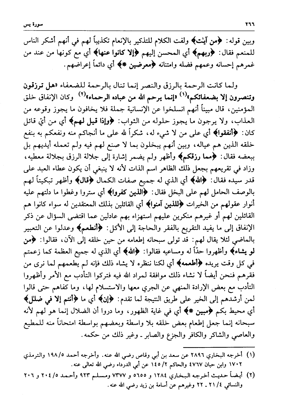 ولما كانت الرحمة بالرزق والنصر إنما تنال بالرحمة للضعفاء ( هل ترزقون وتنصرون إلا بضعفائكم ) ( إنما يرحم الله من عباده الرحماء ) وكان الإنفاق خلق المؤمنين ، قال مبيناً أنهم انسلخوا عن الإنسانية جملة فلا يخافون ما يجوز وقوعه من العذاب ، ولا يرجون ما يجوز حلوله من الثواب : ( وإذا قيل لهم ) أي من أيّ قائل كان : ( أنفقوا ) أي على من لا شيء ، شكراً لله على ما أنجاكم منه ونفعكم به بنفع خلقة الذين هم عياله ، وبين أنهم يبخلون بما لا صنع لهم فيه ولم تعمله أيديهم بل ببعضه فقال : ( مما رزقكم ( وأظهر ولم يضمر إشارة إلى جلالة الرزق بجلالة معطيه ، وزاد في تقريعهم بجعل ذلك الظاهر اسم الذات لأنه لا ينبغي أن يكون عطاء العبد على قدر سيده فقال : ( الله ) أي الذي له جميع صفات الكمال ) قال ( وأظهر تبكيتاً لهم بالوصف الحامل لهم على البخل فقال : ( الذين كفورا ) أي ستروا وغطوا ما دلتهم عليه أنوار عقولهم من الخيرات ) للذين آمنوا ) أي القائلين بذلك المعتقدين له سواء كانوا هم القائلين لهم أو غيرهم منكرين عليهم استهزاء بهم عادلين عما اقتضى السؤال عن ذكر الإنفاق إلى ما يفيد التقريع بالفقر والحاجة إلى الأكل : ( أنطعم ( وعدلوا عن التعبير بالماضي لئلا يقال لهم : قد تولى سبحانه إطعامه من حين خلقه إلى الآن ، فقالوا : ( من لو يشاء ( وأظهروا حدّاً له ومساعيه فقالوا : ( الله ) أي الذي له جميع العظمة كما زعمتم في كل وقت يريده ) أطعمه ) أي لكنا ننظره لا يشاء ذلك فإنه لم يطعمهم لما نرى من فقرهم فنحن أيضاً لا نشاء ذلك بموافقة لمراد الله فيه فتركوا التأدب مع الأمر وأظهروا التأدب مع بعض الإرادة المنهي عن الجري معها والاستسلام لها ، وما كفاهم حتى قالوا لمن أرشدهم إلى الخير على طريق النتيجة لما تقدم : ( إن ) أي ما ) أنتم إلا في ظلال ) أي محيط بكم ) مبين ) أي في غاية الظهور ، وما دروا أن الضلال إنما هو لهم لأنه سبحانه إنما جعل إطعام بعض خلقه بلا واسطة وبعضهم بواسطة امتحاناً منه للمطيع والعاصي والشاكر والكافر والجزع والصابر - وغير ذلك من حكمه .