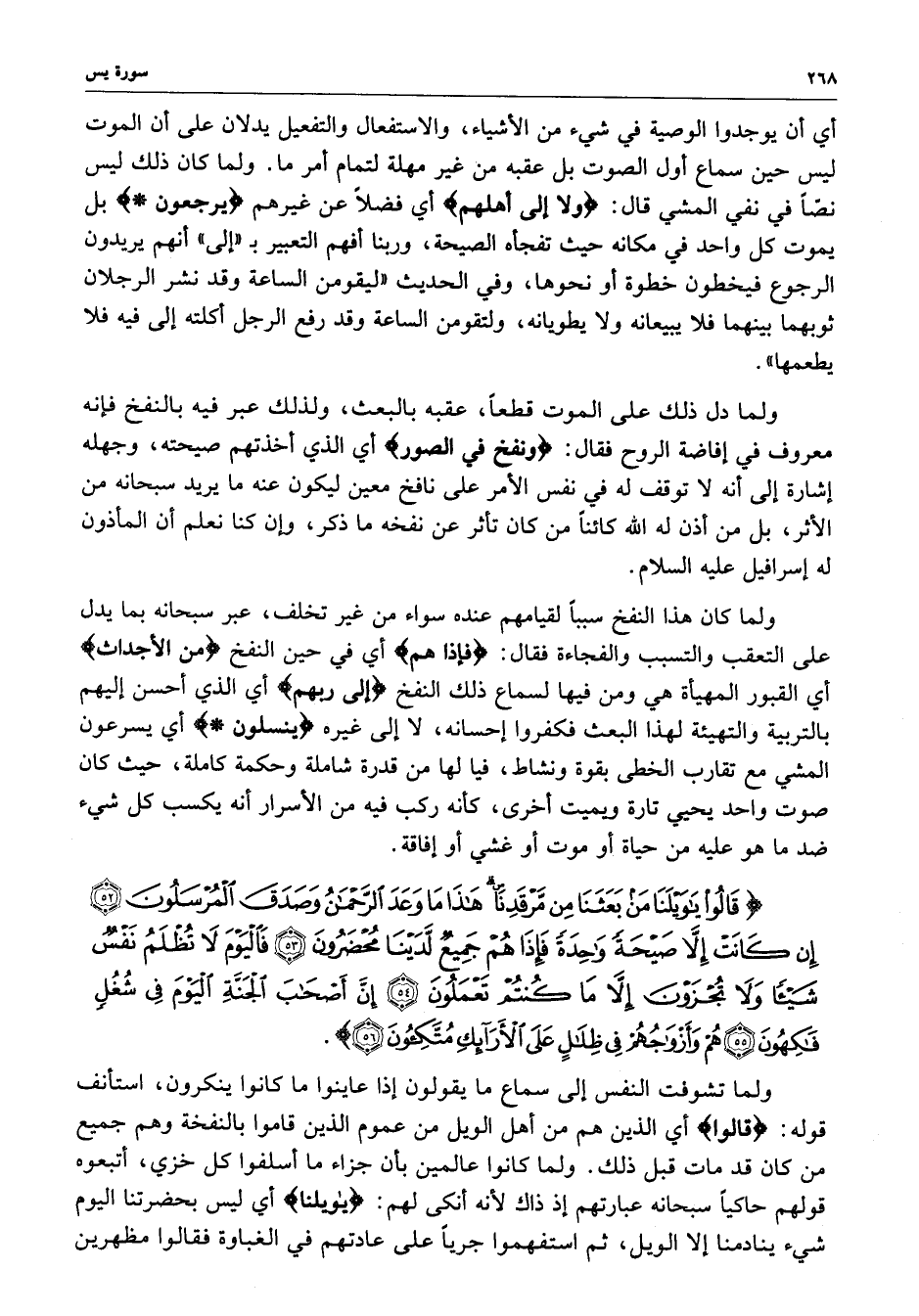 ) قَالُواْ يوَيْلَنَا مَن بَعَثَنَا مِن مَّرْقَدِنَا هَذَا مَا وَعَدَ الرَّحْمنُ وَصَدَقَ الْمُرْسَلُونَ إِن كَانَتْ إِلاَّ صَيْحَةً وَاحِدَةً فَإِذَا هُمْ جَمِيعٌ لَّدَيْنَا مُحْضَرُونَ فَالْيَوْمَ لاَ تُظْلَمُ نَفْسٌ شَيْئاً وَلاَ تُجْزَوْنَ إِلاَّ مَا كُنْتُمْ تَعْمَلُونَ إِنَّ أَصْحَابَ الْجَنَّةِ اليَوْمَ فِي شُغُلٍ فَاكِهُونَ هُمْ وَأَزْوَاجُهُمْ فِي ظِلاَلٍ عَلَى الأَرَآئِكِ مُتَّكِئُونَ ( ( )