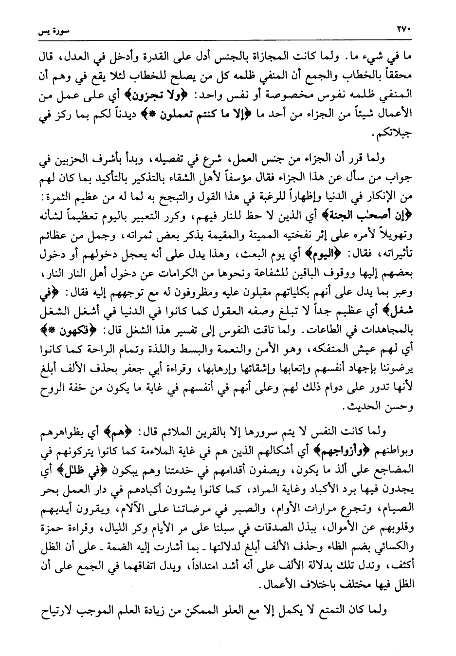 ولما قرر أن الجزاء من جنس العمل ، شرع في تفصيله ، وبدأ بأشراف الحزبين في جواب من سأل عن هذا الجزاء فقال مؤسفاً لأهل الشقاء بالتذكير بالتأكيد بما كان لهم من الإنكار في الدنيا وإظهار للرغبة في هذا القول والتجح به لما له من عظيم الثمرة : ( إن اصحاب الجنة ) أي الذين لا حظ للنار فيهم ، وكرر التعبير باليوم تعظيماً لشأنه وتهويلاً لأمره على إثر نفختيه المميتة والمقيمة بذكر بعض ثمراته ، وجمل من عظائم تأثيراته ، فقال : ( اليوم ) أي يوم البعث ، وهذا يدل على أنه يعجل دخولهم أو دخول بعضهم إليها ووقوف الباقين للشفاعة ونحوها من الكرامات عن دخول أهل النار النار ، وعبر بما يدل على أنهم بكلياتهم مقبلون عليه ومظروفون له مع توجههم إليه فقال : ( في شغل ) أي عظيم جداً لا تبلغ وصفه العقول كما كانوا في الدنيا في أشغل الشغل بالمجاهدات في الطاعات .