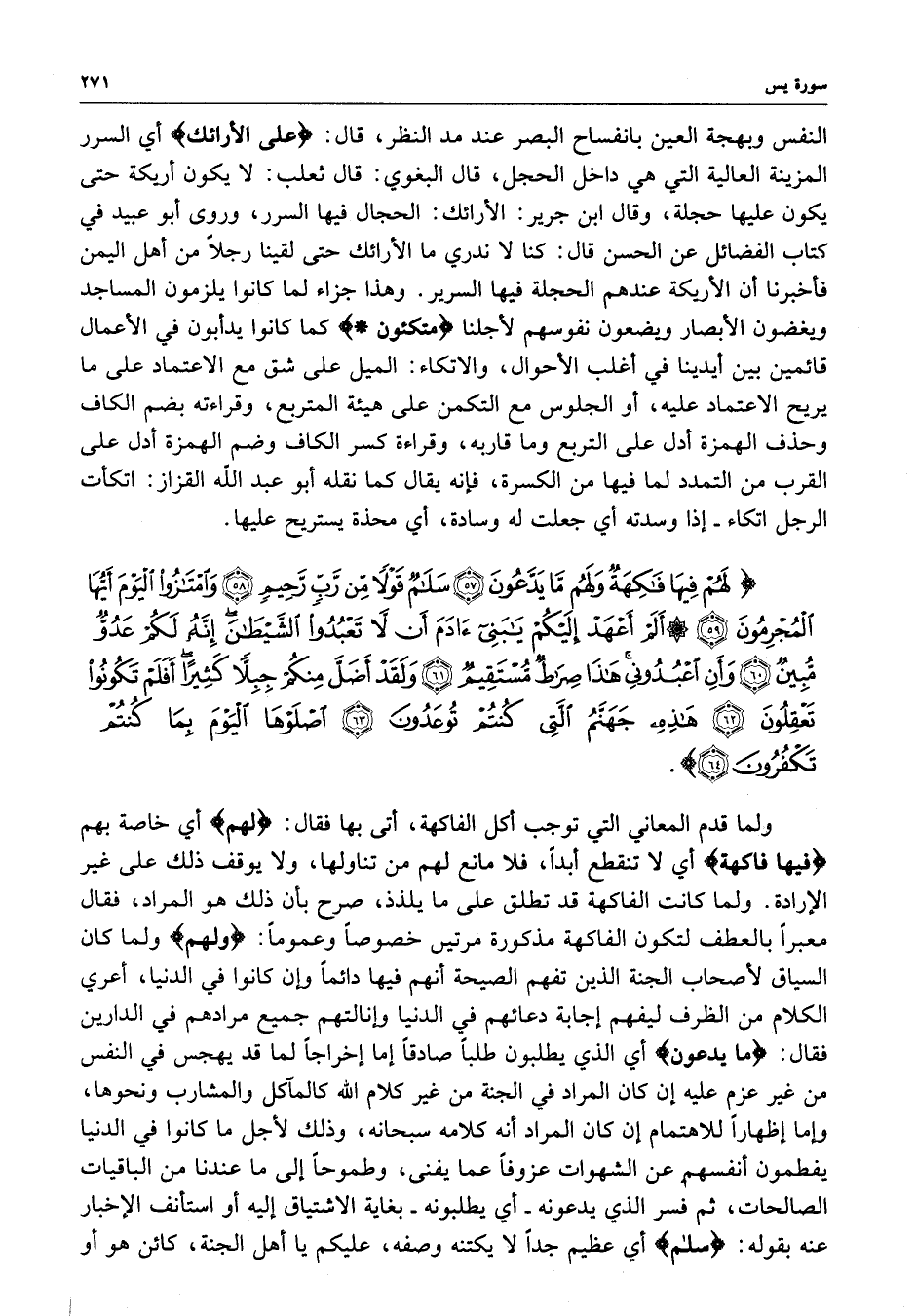 النفس وبهجة العين بانفساح البصر عند مد النظر ، قال : ( على الأرائك ) أي السرر المزينة العالية التي هي داخل الحجل ، قال البغوي : قال ثعلب : لا يكون أريكة حتى يكون عليها حجلة ، وقال ابن جرير : الأرائك : الحجال فيها السرر ، وروى أبو عبيد في كتاب الفضائل عن الحسن قال : كنا لا ندري ما الأرائك حتى لقينا رجلاً من أهل اليمن فأخبرنا أن الأريكة عندهم الحجلة فيها السرير .