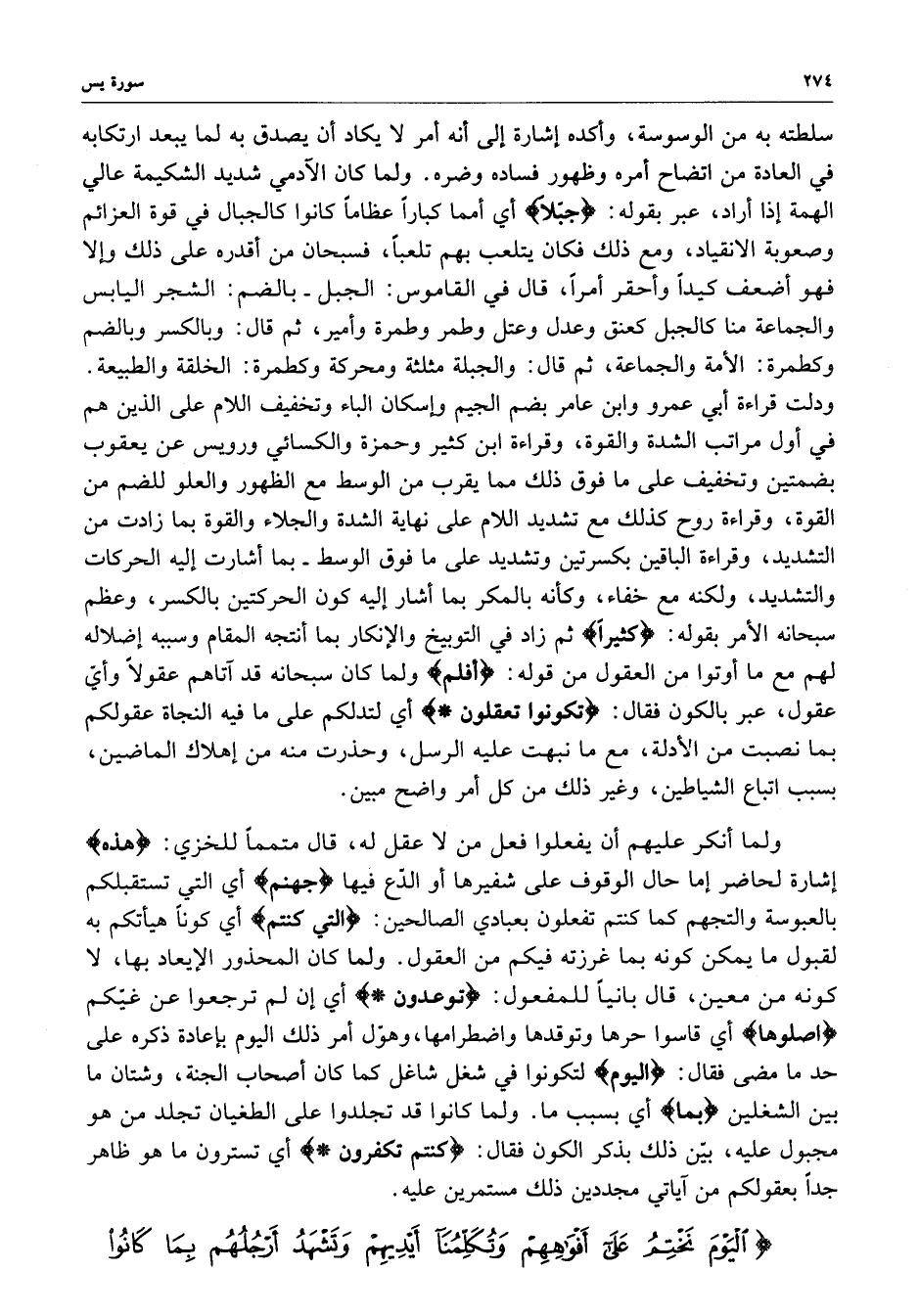 ودلت قراءة أبي عمرو وابن عامر بضم الجيم وإسكان الباء وتخفيف اللام على الذين هم في أول مراتب الشدة والقوة ، وقراءة ابن كثير وحمزة والكسائي ورويس عن يعقوب بضمتين وتخفيف على ما فوق ذلك مما يقرب من الوسط مع الظهور والعلو للضم من القوة ، وقراءة روح كذلك مع تشديد على ما فوق الوسط - بما أشارت إليه الحركات والتشديد ، ولكنه مع خفاء ، وكأنه بالمكر بما أشار إليه كون الحركتين بالكسر ، وعظم سبحانه الأمر بقوله : ( كثيراً ( ثم زاد في التوبيخ والإنكار بما أنتجه المقام وسببه إضلاله لهم مع ما اوتوا من العقول من قوله : ( أفلم ( ولما كان سبحانه قد آتاهم عقولاً وأيّ عقول ، عبر بالكون فقال : ( تكونوا تعقلون ) أي لتدلكم على ما فيه النجاة عقولكم بما نصبت من الأدلة ، ومع ما نبهت عليه الرسل ، وحذرت منه من إهلاك الماضين ، بسبب اتباع الشياطين ، وغير ذلك من كل أمر واضح مبين .