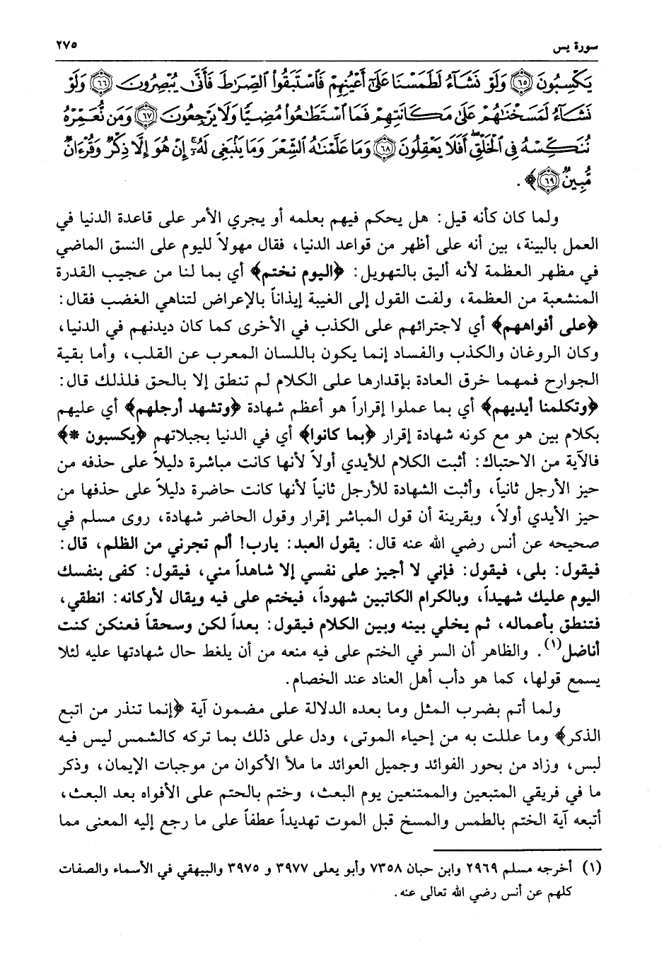 ولما كان كأنه قبل : هل يحكم فبهم بعلمه أو يجري الأمر على قاعدة الدنيا في العمل بالبينة ، بين أنه على أظهر من قواعد الدنيا ، فقال مهولاً لليوم على النسق الماضي في مظهر العظمة لأنه أيق بالتهويل : ( اليوم نختم ) أي بما لنا من عجيب القدرة المنشعبة من العظمة ، ولفت القول إلى الغيبة إيذاناً بالإعراض لتناهي الغضب فقال : ( على أفواههم ) أي لاجترائهم على الكذب في الأخرى كما كان ديدنهم في الدنيا ، وكان الروغان والكذب والفساد إنما يكون باللسان المعرب عن القلب ، وأما بقية الجوارح فمهما خرق العادة بإقدارها على الكلام لم تنطق إلا بالحق فلذلك قال : ( وتكلمنا أيديهم ) أي بما عملوا إقراراً عو أعظم شهادة ) وتشهد أرجلهم ) أي عليهم بكلام بين هو مع كونه شهادة إقرار ) بما كانوا ) أي في الدنيا بجبلاتهم ) يكسبون ( فالآية من الاحتباك : أثبت الكلام للأيدي أولاً لأنها كانت مباشرة دليلاً على حذفه من حيز الأرجل ثانيا ، وأثبت الشهادة للأرجل ثانياً لأنها كانت حاضرة دليلاً على حذفها من حيز الأرجل أولاً ، وبقرينه أن قول المباشر إقرار وقول الحاضر شهادة ، روى مسلم في صحيحه عن أنس رضي الله عنه قال : يقول العبد : يا رب ألم تجرني من الظلم ، قال : فيقول : بلى ، فيقول : فإني لا أجيز على نفسي إلا شاهداً مني ، فيقول : كفى بنفسك اليوم عليك شهيداً ، وبالكرام الكاتبين شهوداً ، فيختم على فيه ويقال لأركانه : انطقي ، فتنطق بأعماله ، ثم يخلي بينه وبين الكلام فيقول : بعداً لكن وسحقاً فعنكن كنت أناضل .