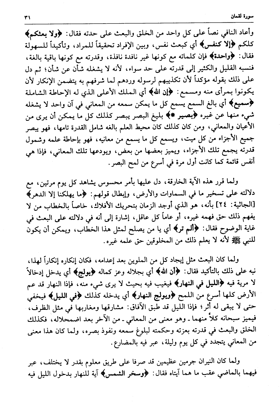 وأعاد النافي نصاًَ على كل واحد من الخلق والبعث على حدته فقال : ( ولا بعثكم ( كلكم ) إلا كنفس ) أي كبعث نفس ، وبين الأفراد تحقيقاً للمراد ، وتأكيداً للسهولة فقال : ( واحدة ( فإن كلماته مع كونها غير نافذة نافذة ، وقدرتها مع كونها باقية بالغة ، فنسبه القليل والكثير إلى قدرته على حد سواء ، لأنه لا يشغله شأن عن شأن ، ثم دل على ذلك بقوله مؤكداً لأن تكذيبهم لرسوله وردهم لما شرفهم به يتضمن الإنكار لأن يكونوا بمرأى منه ومسمع : ( إن الله ) أي الملك الأعلى الذي له الإحاطة الشاملة ) سميع ) أي بالغ السمع يسمع كل ما يمكن سمعه من المعاني في آن واحد لا يشغله شيء منها عن غيره ) بصير ( بليغ البصر يبصر كذلك كل ما يمكن أن يرى من الأعيان والمعاني ، ومن كان كذلك كان المحيط العلم بالغه شامل القدرة تامها ، فهو يبصر جميع الأجزاء من كل ميت ، ويسمع كل ما يسمع من معانيه ، فهو بإحاطة علمه وشمول قدرته يجمع تلك الأجزاء ، ويميز بعضها من بعض ، ويودعها تلك المعاني ، فإذا هي أنفس قائمة كما كانت أول مرة في أسرع من لمح البصر .