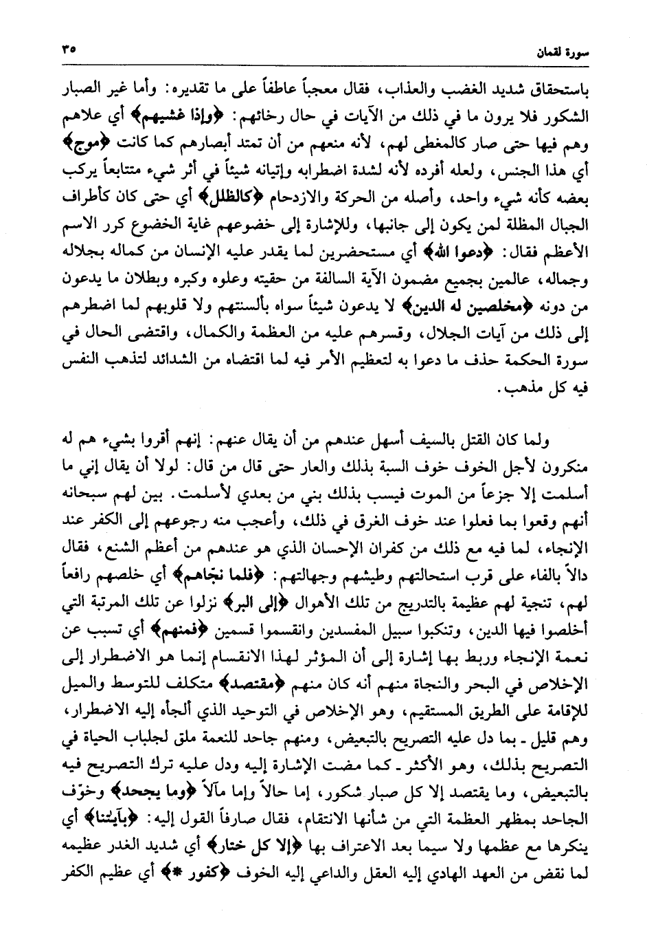 باستحقاق شديد الغضب والعذاب ، فقال معجباً عاطفاً على ما تقديره : وأما غير الصبار الشكور فلا يرون ما في ذلك من الآيات في حال رخائهم : ( وإذا غشيهم ) أي علاهم وهو فيها حتى صار كالمغطى لهم ، لأنه منعم من أن تمتد أبصارهم كما كانت ) موج ) أي هذا الجنس ، ولعله أفرده لأنه لشدة اضطرابه وإيتانه شيئاً في أثر متتابعاً بركب بعضه كأنه شيء واحد ، وأصله من الحركة والازدحام ) كالظلل ) أي حتى كان كأطراف الجبال المظلمة لمن يكون إلى جانبها ، وللإشارة إلى خضوعهم غاية الخضوع كرر الأسم الأعظم فقال : ( دعوا الله ) أي مستحضرين لما يقدر عليه الإنسان من كماله بجلاله وجماله ، عالمين بجميع مضمون الآية السالفة من حقيته وعلوه وكبره وبطلان ما يدعون من دونه ) مخلصين له الدين ( لا يدعون شيئاً سواه بألسنتهم ولا قلوبهم لما اضطرهم إلى ذلك من آيات الجلال ، وقسرهم عليه من العظمة والكمال ، واقتضى الحال في سورة الحكمة حذف ما دعوا به لتعظيم الأمر فيه لما اقتضاه من الشدائد لتذهب النفس فيه كل مذهب .