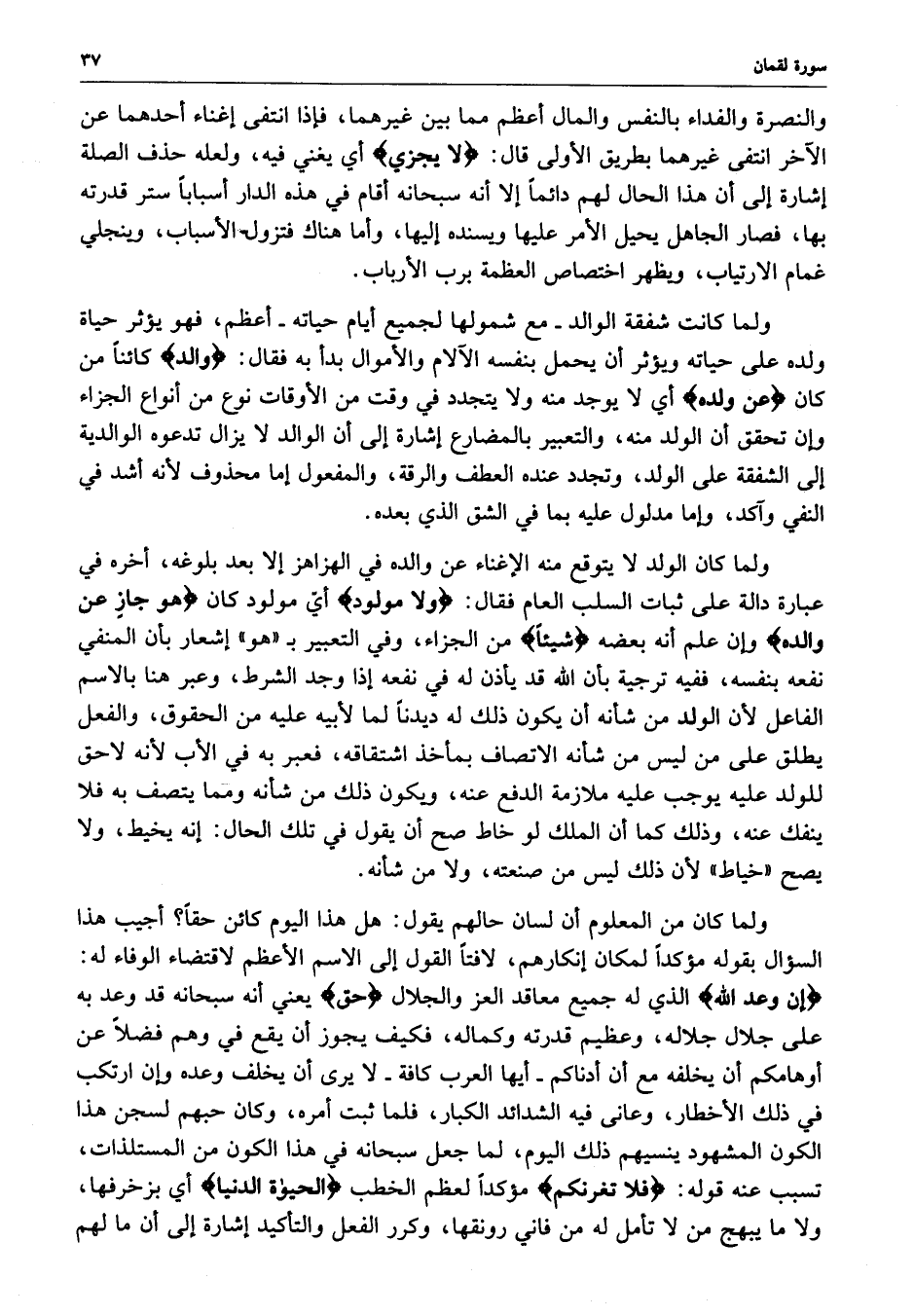 ولما كان الولد لا يتوقع منه الإغناء عن والده في الهزاهز إلا بعد بلوغه ، أخره في عبارة دالة على ثبات السلب العام فقال : ( ولا مولود ) أي مولود كان ) هو جاز عن والده ( وإن علم أنه بعضه ) شيئاً ( من الجزاء ، وفي التعبير ب ( هو ) إشعار بأن المنفي نفعه بنفسه ، ففيه ترجية بأن الله قد يأذن له في نفعه إذا وجد الشرط ، وعبر هنا بالاسم الفاعل لأن الولد من شأنه أن يكون ذلك له ديدناً لما لأبيه عليه من الحقوق ، والفعل يطلق على من ليس من شأنه الاتصاف بمأخذ اشتقاقه ، فعبر به في الأب لأنه لاحق للولد عليه يوجب عليه ملازمة الدفع عنه ، ويكون ذلك من شأنه ومما يتصف به فلا ينفك عنه ، وذلك كما أن الملك لو خاط صح أن يقول في تلك الحال : أنه يخيط ، ولا يصح ( خياط ) لأن ذلك ليس من صنعته ، ولا من شأنه .