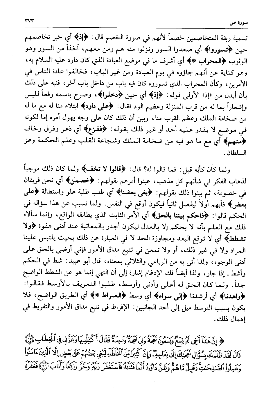 ) إِنَّ هَذَآ أَخِي لَهُ تِسْعٌ وَتِسْعُونَ نَعْجَةً وَلِي نَعْجَةٌ وَاحِدَةٌ فَقَالَ أَكْفِلْنِيهَا وَعَزَّنِي فِي الْخِطَابِ قَالَ لَقَدْ ظَلَمَكَ بِسُؤَالِ نَعْجَتِكَ إِلَى نِعَاجِهِ وَإِنَّ كَثِيراً مِّنَ الْخُلَطَآءِ لَيَبْغِي بَعْضُهُمْ عَلَى بَعْضٍ إِلاَّ الَّذِينَ آمَنُواْ وَعَمِلُواْ الصَّالِحَاتِ وَقَلِيلٌ مَّا هُمْ وَظَنَّ دَاوُودُ أَنَّمَا فَتَنَّاهُ فَاسْتَغْفَرَ رَبَّهُ وَخَرَّ رَاكِعاً وَأَنَابَ فَغَفَرْنَا