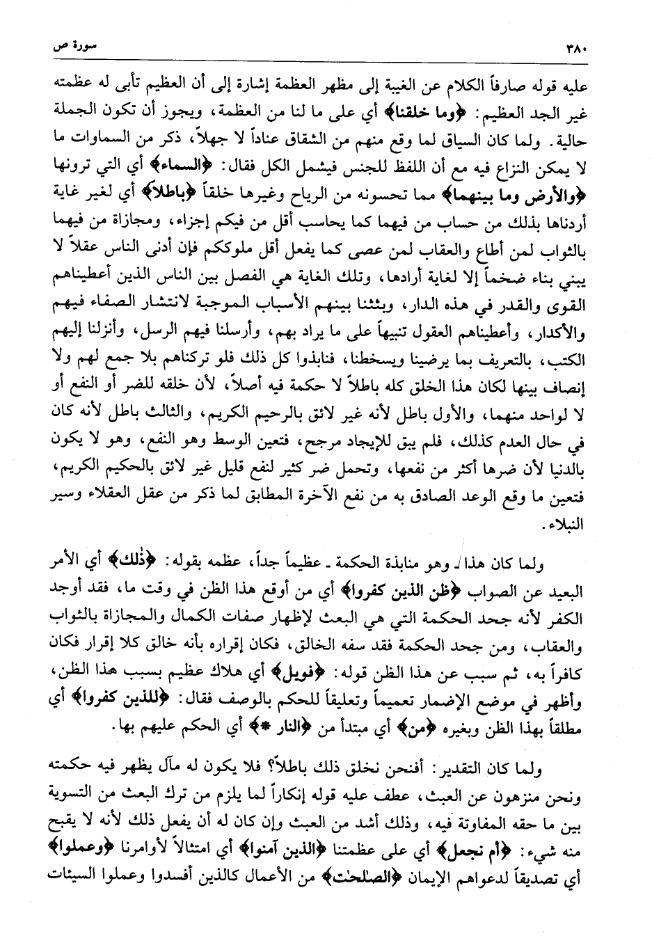 ولما كان السياق لما وقع من الشقاق عناداً لا جهلاً ، ذكر من السماوات ما لا يمكن النزاع فيه مع أن اللفظ للجنس فيشمل الكل فقال : ( السماء ) أي التي ترونها ) والأرض وما بينهما ( مما تحسونه من الرياح وغيرها خلقا ) باطلاً ) أي لغير غاية أردناها بذلك من حساب من فيهما كما يحاسب أقل من فيكم إجزاء ، ومجازاة من فيهما بالثواب لكن أطاع والعقاب لمن عصى كما يفعل أقل ملوككم فإن أدنى الناس عقلاً لا يبني بناء ضخماً إلا لغاية أرادها ، وتلك الغاية هي الفصل بين الناس الذين أعطيناهم القوى والقدر في هذه الدار ، وبثثنا بينهم الأسباب الموجبة لانتشار الصفاء فيهم والأكدار ، وأعطيناهم العقول تنبيهاً على ما يراد ، وأرسلنا فيهم الرسل ، وأنزلنا إليهم الكتب ، بالتعريف بما يرضينا ويسخطنا ، فنابذوا كل ذلك فلو تركناهم بلا جمع لهم ولا إنصاف بينها لكان هذا الخلق كله باطلاً لا حكمة فيه اصلاً ، لأن خلقه للضر أو النفع أو لا لواحد منهما ، والأول باطل لأنه غير لائق بالرحيم الكريم ، والثالث باطل لأنه كان في حال العدم كذلك ، فلم يبق للإيجاد مرجح ، فتعين الوسط وهو النفع ، وهو لا يكون بالدنيا لأن ضرها أكثر من نفعها ، وتحمل ضر كثير لنفع غير لائق بالحكيم الكريم ، فتعين ما وقع الوعد الصادق به من نفع الآخرة المطابق لما ذكر من عقل العقلاء وسير النبلاء .
