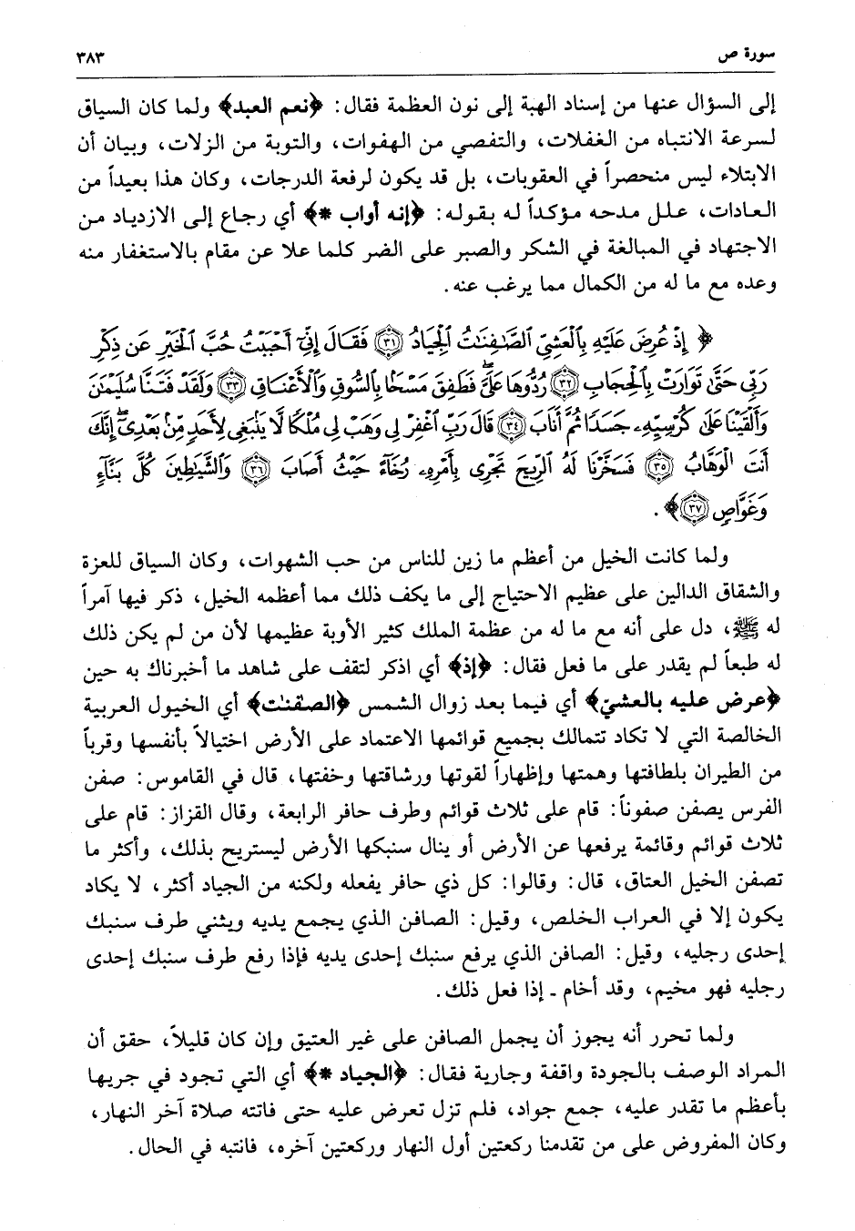) إِذْ عُرِضَ عَلَيْهِ بِالْعَشِيِّ الصَّافِنَاتُ الْجِيَادُ فَقَالَ إِنِّي أَحْبَبْتُ حُبَّ الْخَيْرِ عَن ذِكْرِ رَبِّي حَتَّى تَوَارَتْ بِالْحِجَابِ رُدُّوهَا عَلَيَّ فَطَفِقَ مَسْحاً بِالسُّوقِ وَالأَعْنَاقِ وَلَقَدْ فَتَنَّا سُلَيْمَانَ وَأَلْقَيْنَا عَلَى كُرْسِيِّهِ جَسَداً ثُمَّ أَنَابَ قَالَ رَبِّ اغْفِرْ لِي وَهَبْ لِي مُلْكاً لاَّ يَنبَغِي لأَحَدٍ مِّن بَعْدِي إِنَّكَ أَنتَ الْوَهَّابُ فَسَخَّرْنَا لَهُ الرِّيحَ تَجْرِي بِأَمْرِهِ رُخَآءً حَيْثُ أَصَابَ وَالشَّيَاطِينَ كُلَّ بَنَّآءٍ وَغَوَّاصٍ ( ( )