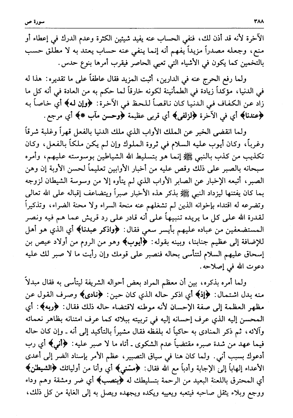 ولما أمره بذكره ، بين أن معظم المراد بعض أحواله الشريفة ليتأسى به فقال مبدلاً منه بدل اشتمال : ( إذ ) أي اذكر حاله الذي كان حين : ( نادى ( وصرف القول عن مظهر العظمة إلى صفة الإحسان لأنه موطنه لاقتضاء حاله ذلك فقال : ( ربه ( : أي المحسن إليه الذي عرف إحسانه إليه في تربيته ببلائه كما عرف امتنانه بظاهر نعمائه وآلائه ، ثم ذكر المنادى به حاكياً له بلفظه فقال مشيراً بالتأكيد إلى أنه وإن كان حاله فيما عهد من شدة صبره مقتضياً عدم الشكوى أتاه ما لا صبر عليه : ( إني ) أي أدعوك إلهاباً إلى الإجابة وأدباً مع الله فقال : ( مسّني ) أي وأنا من أوليائك ) الشيطان ) أي المحترق باللعنة البعيد من الرحمة بتسليطك له ) بنصب ) أي ضر ومشقة وهم داء ووجع وبلاء يثقل صاحبه فيتبعه ويعيده ويكده ويجهده ويصل به إلى الغاية من كل ذلك ،